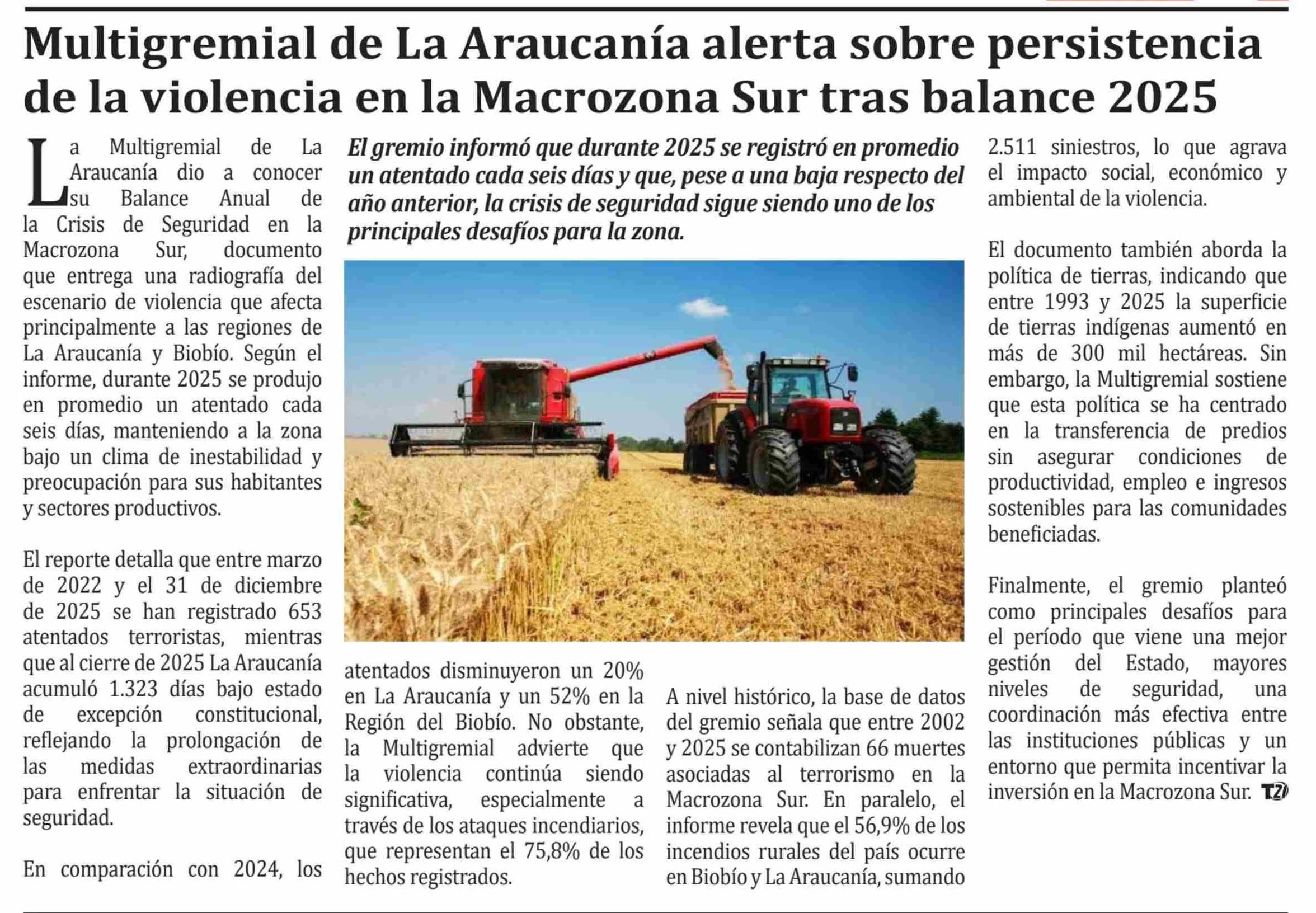 Multigremial de La Araucanía alerta sobre persistencia de la violencia en la Macrozona Sur tras balance 2025