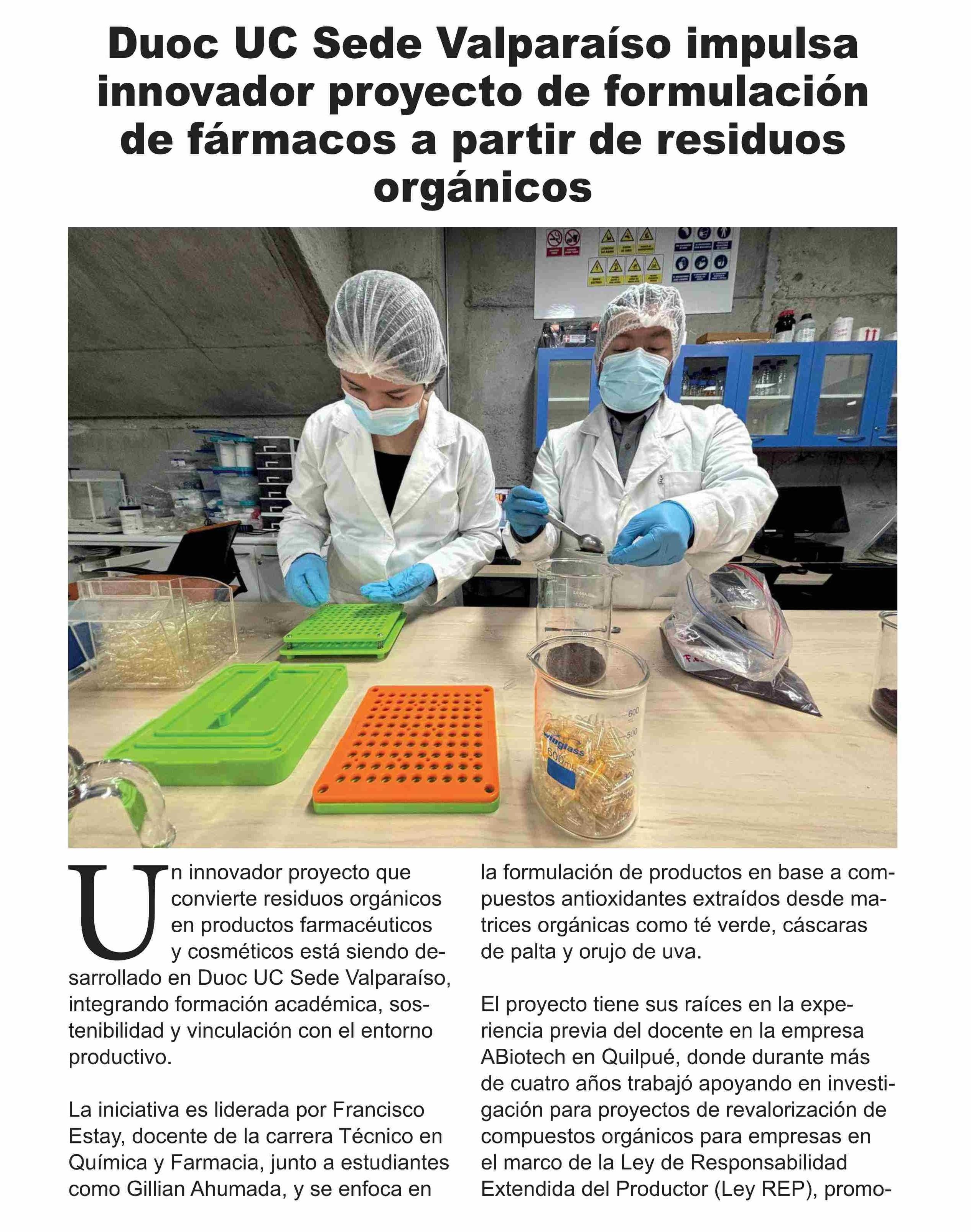 | Título: | Duoc UC Sede Valparaíso impulsa innovador proyecto de formulación de fármacos a partir de residuos orgánicos |