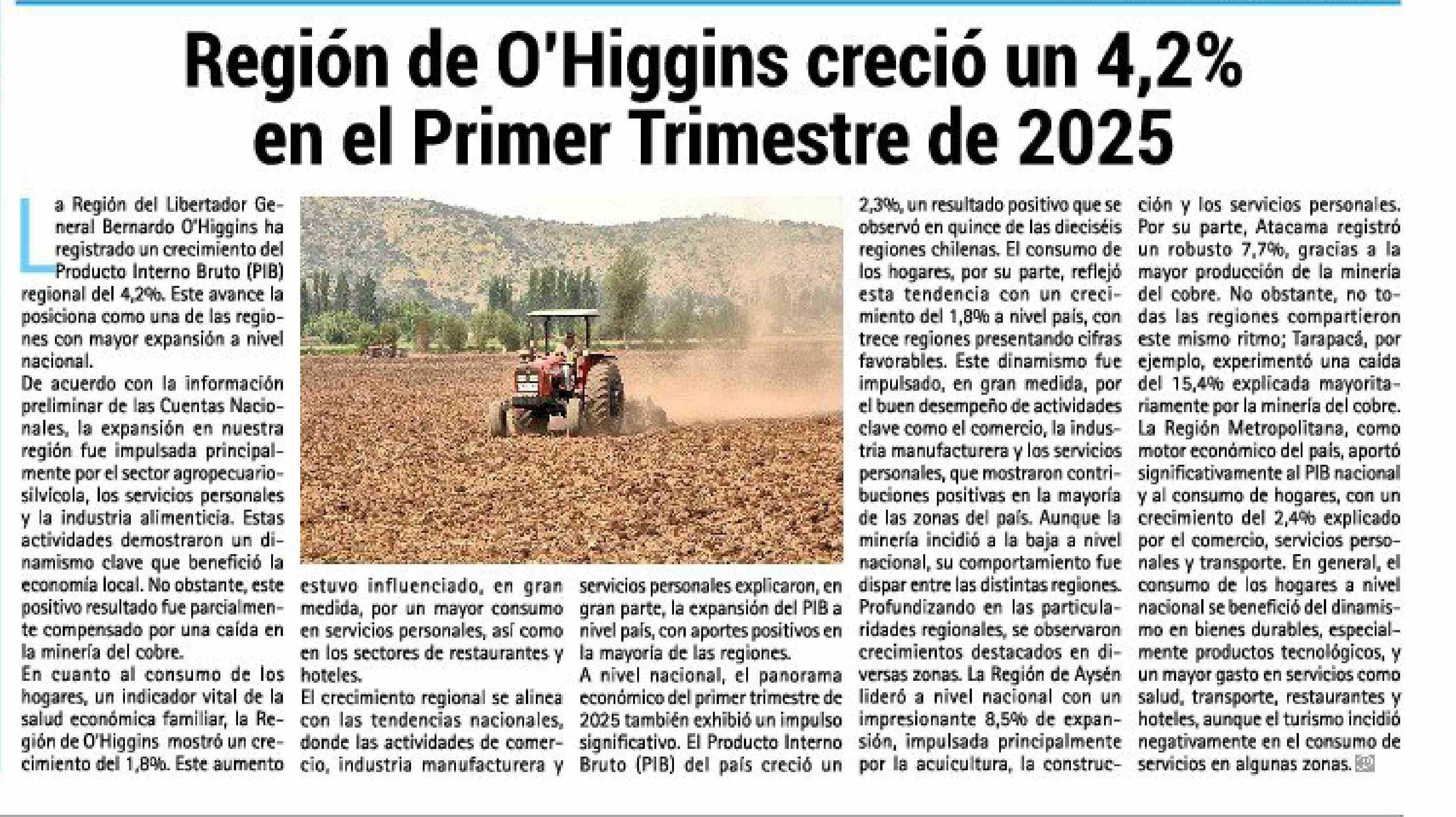 Región de O'Higgins creció un 4,2% en el Primer Trimestre de 2025