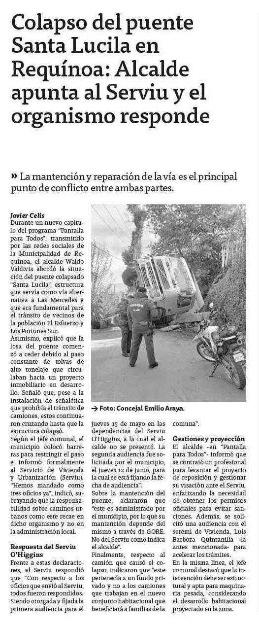 Colapso del puente Santa Lucila en Requínoa: Alcalde apunta al Serviu y el organismo responde