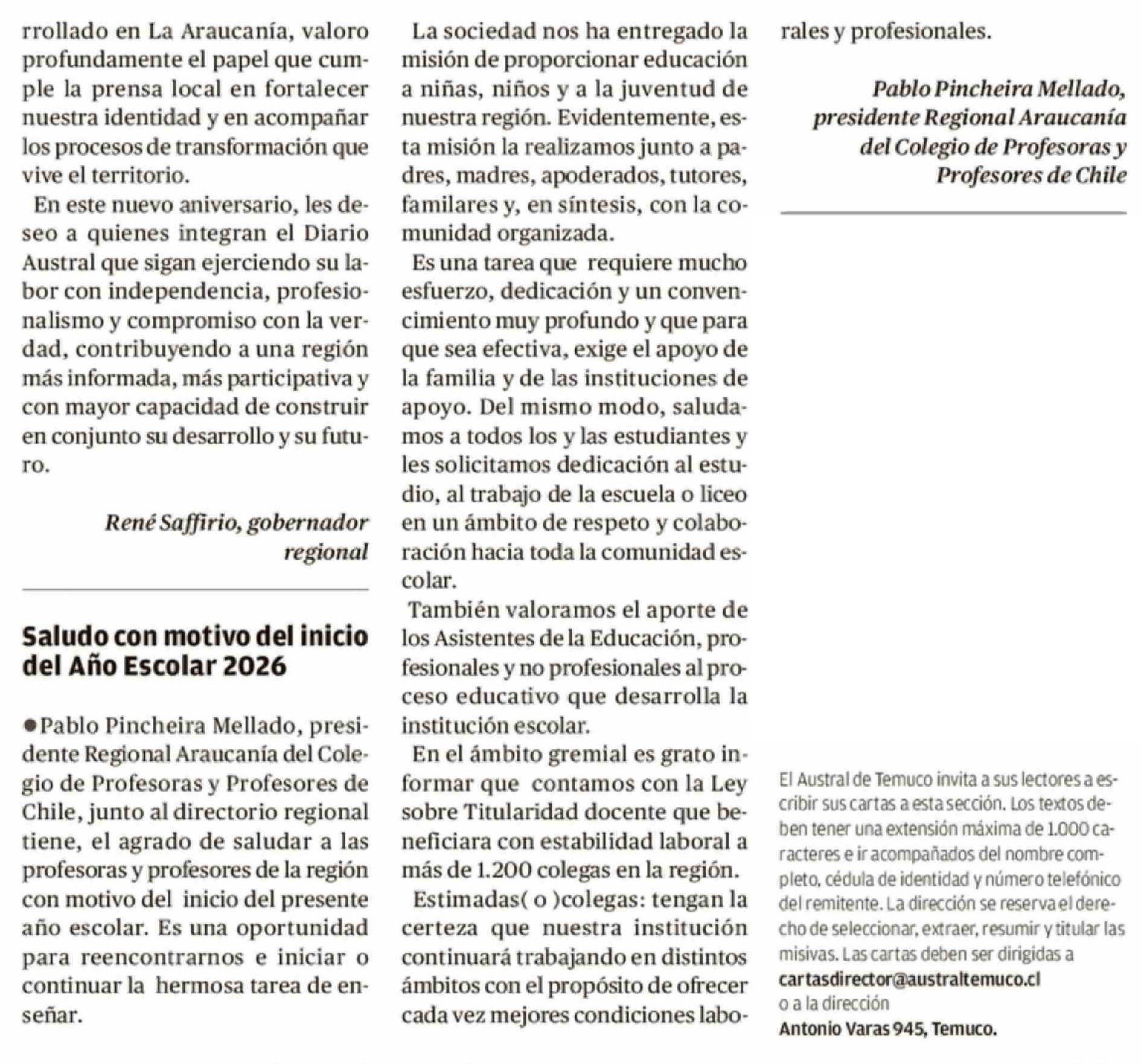 Título: CARTAS: Saludo con motivo del inicio del Año Escolar 2026