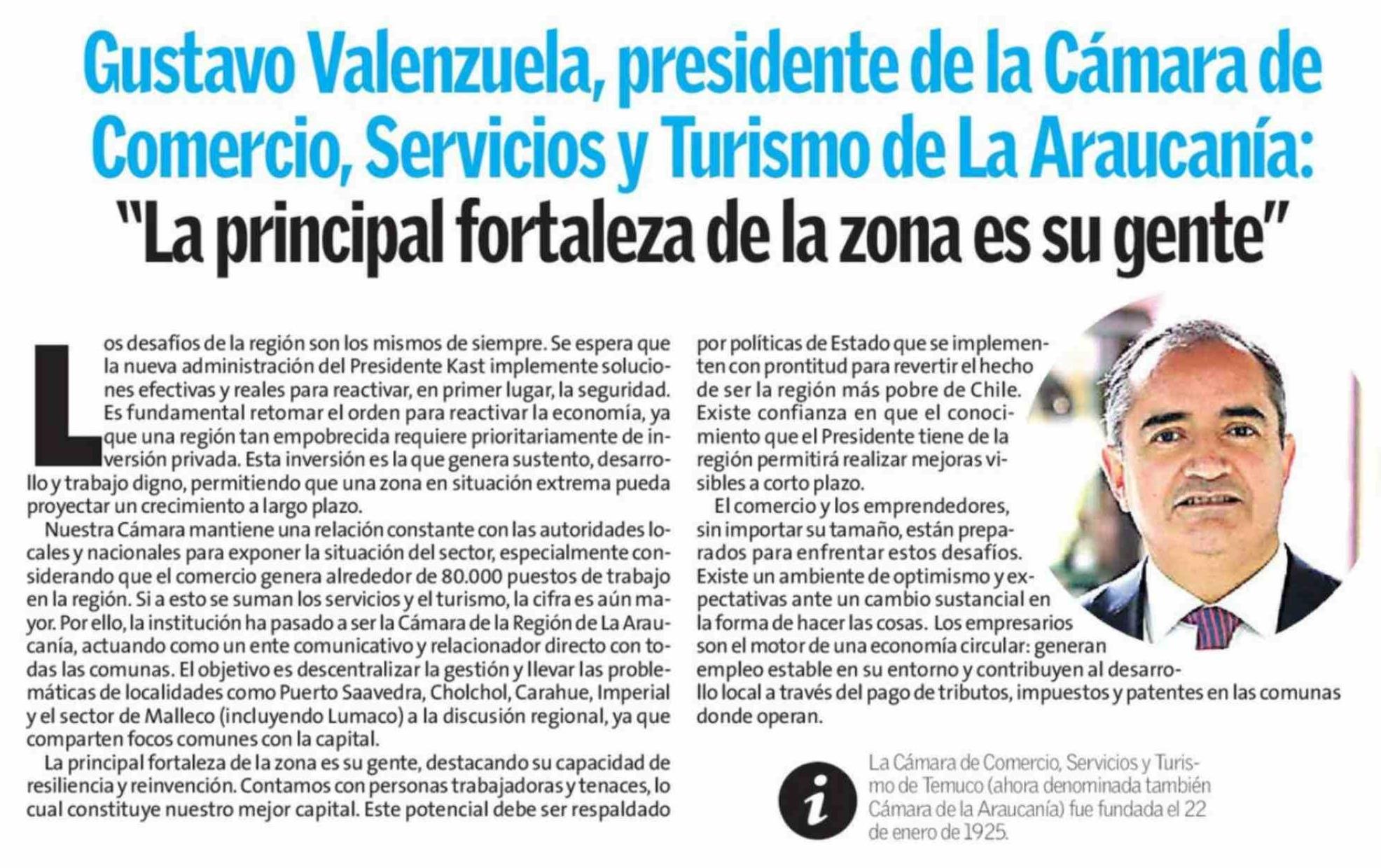 | Título: | Columnas de Opinión: Gustavo Valenzuela, presidente de la Cámara de Comercio, Servicios y Turismo de La Araucanía: "La principal fortaleza de la zona es su gente" |