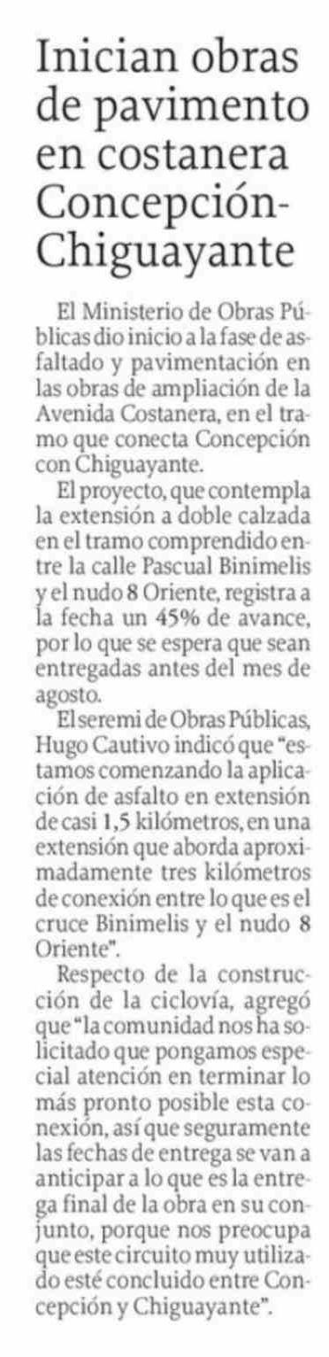 Inician obras de pavimento en costanera ConcepciónChiguayante