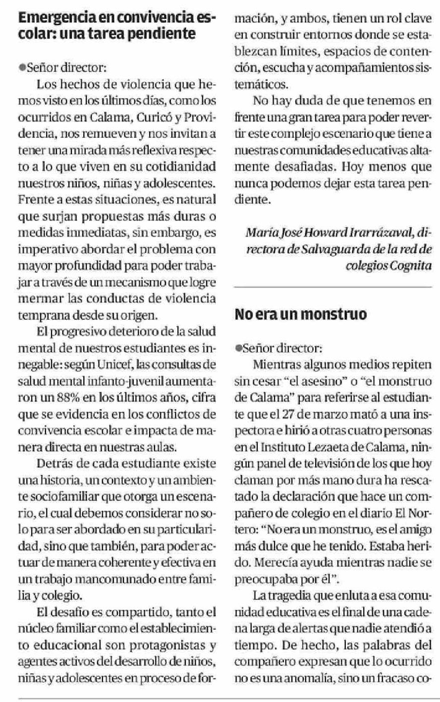 CARTAS: Emergencia en convivencia escolar una tarea pendiente