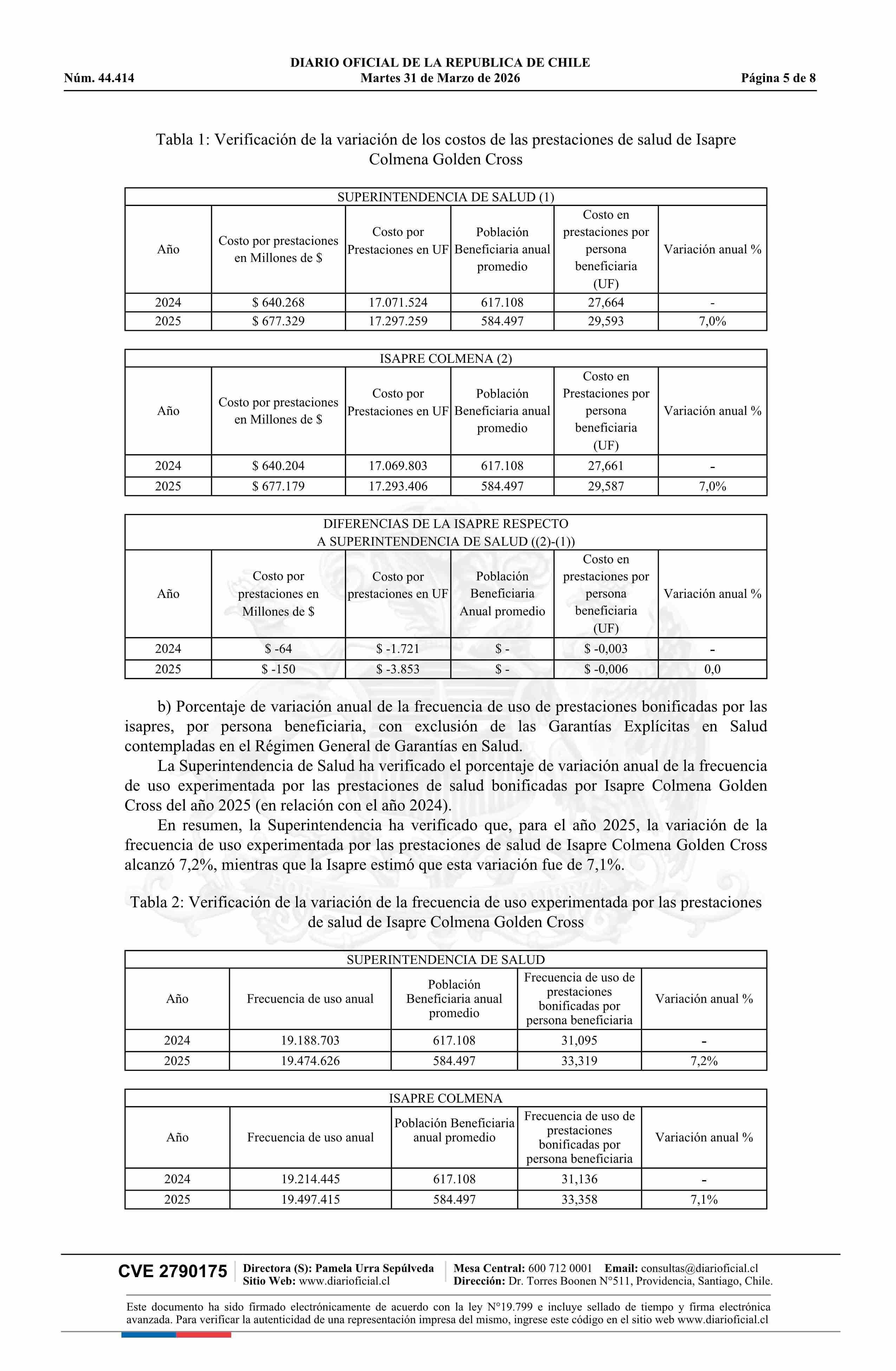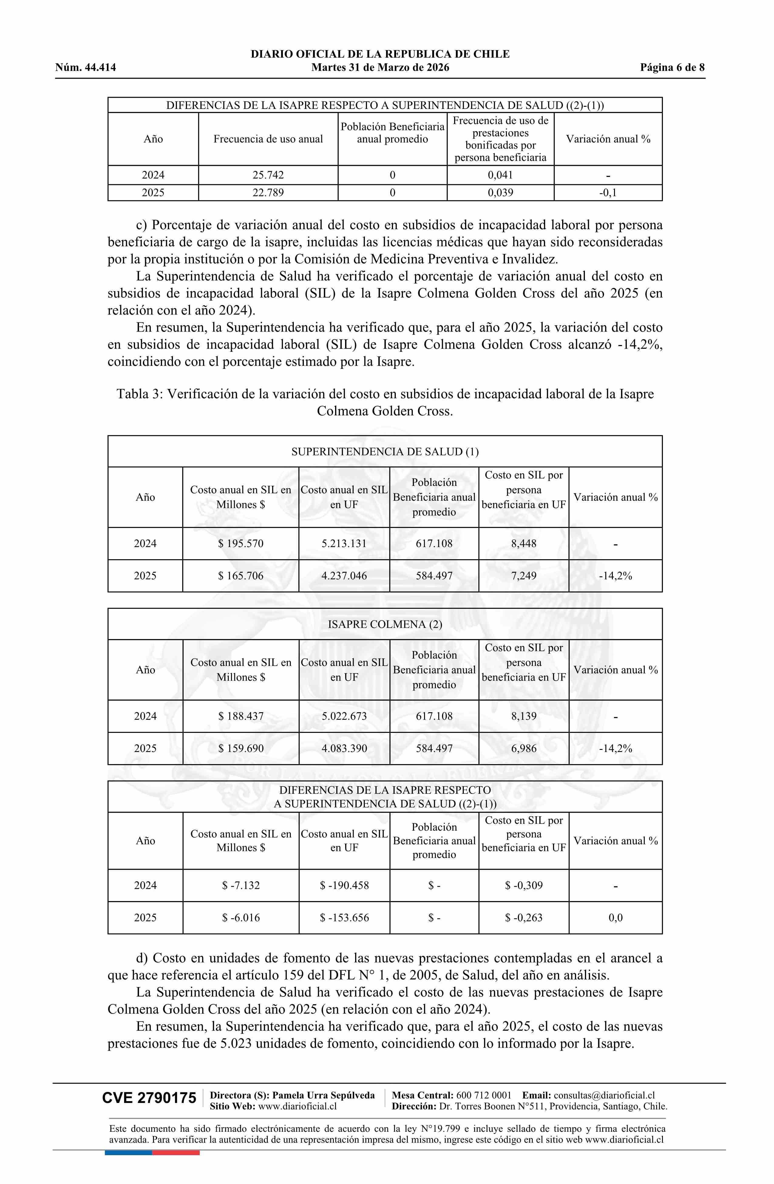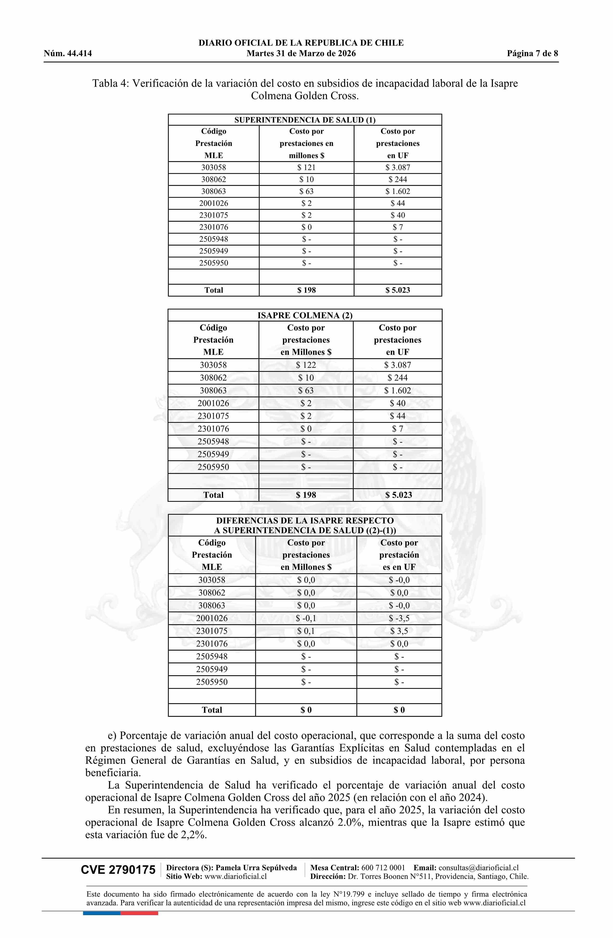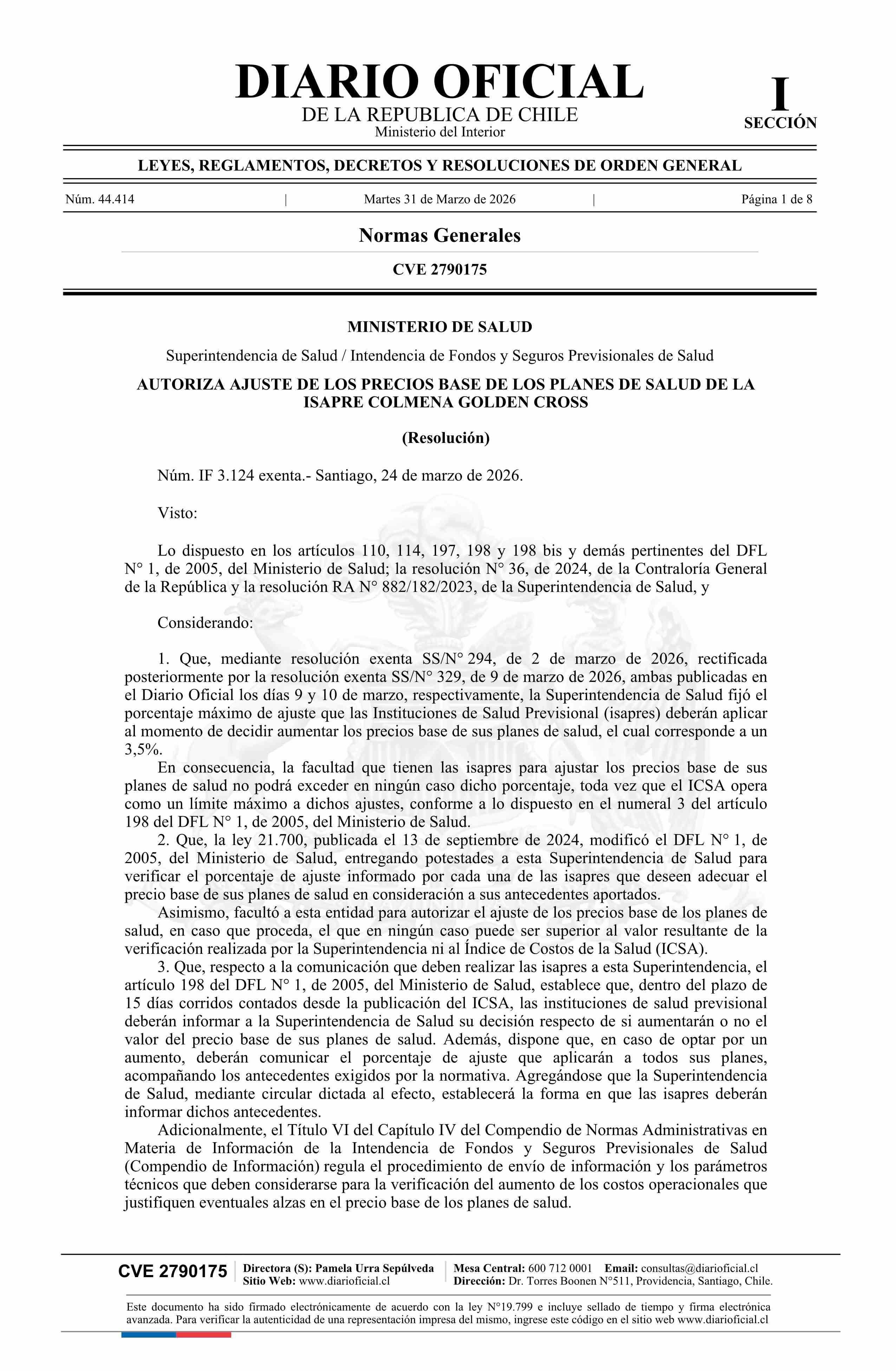 | Título: | Resolución exenta número IF 3.124, de 2026.- Autoriza ajuste de los precios base de los planes de salud de la Isapre Colmena Golden Cross |