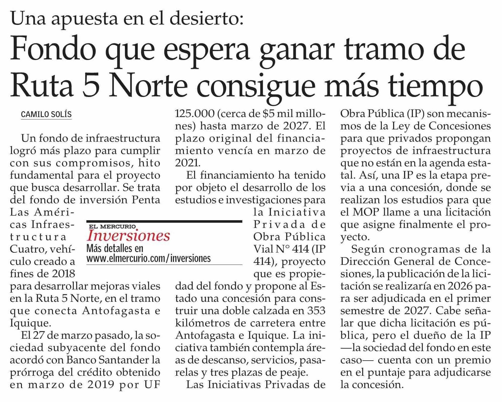 Fondo que espera ganar tramo de Ruta 5 Norte consigue más tiempo