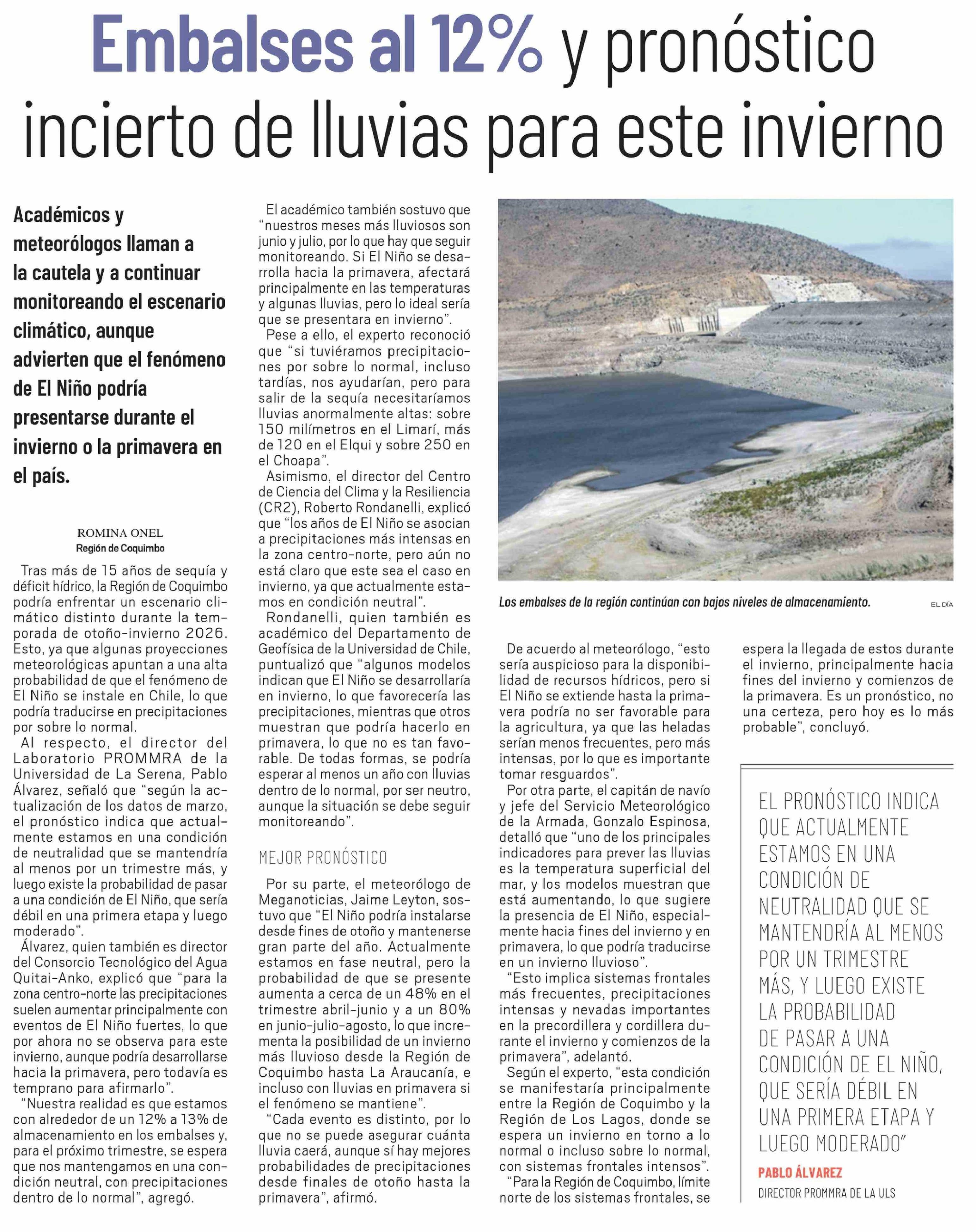 Embalses al 12% y pronóstico incierto de lluvias para este invierno