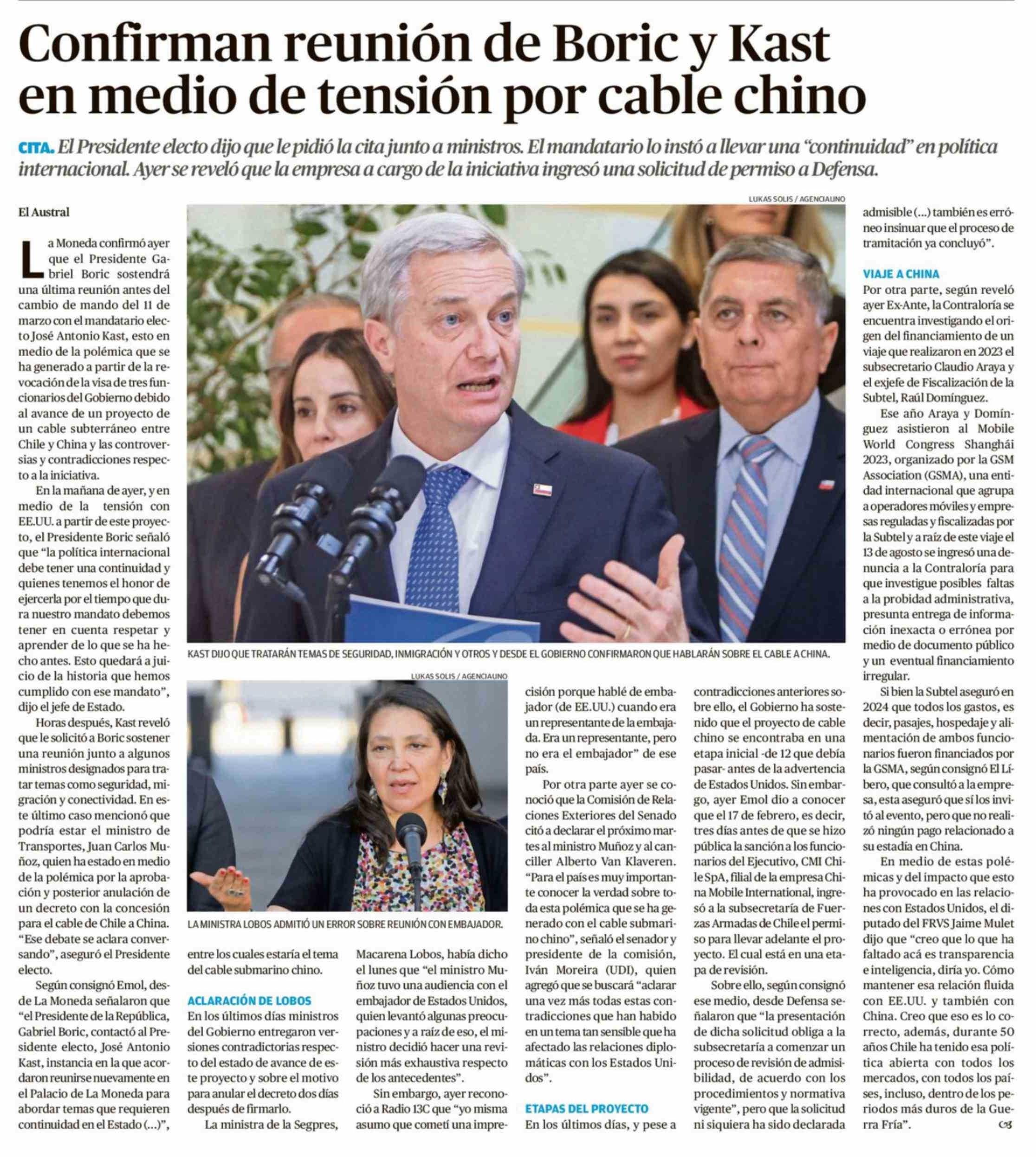 Confirman reunión de Boric y Kast en medio de tensión por cable chino