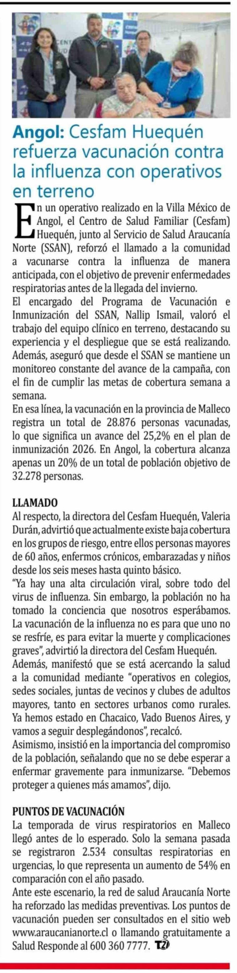 Angol: Cesfam Huequen refuerza vacunación contra la influenza con operativos en terreno