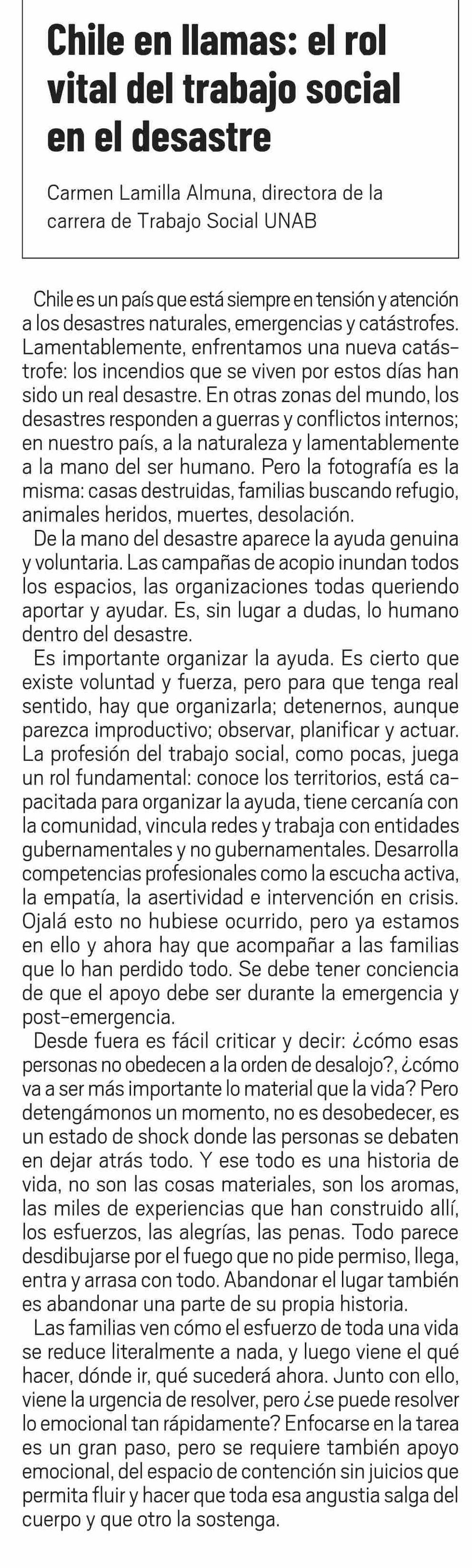 Columnas de Opinión: Chile en llamas: el rol vital del trabajo social en el desastre