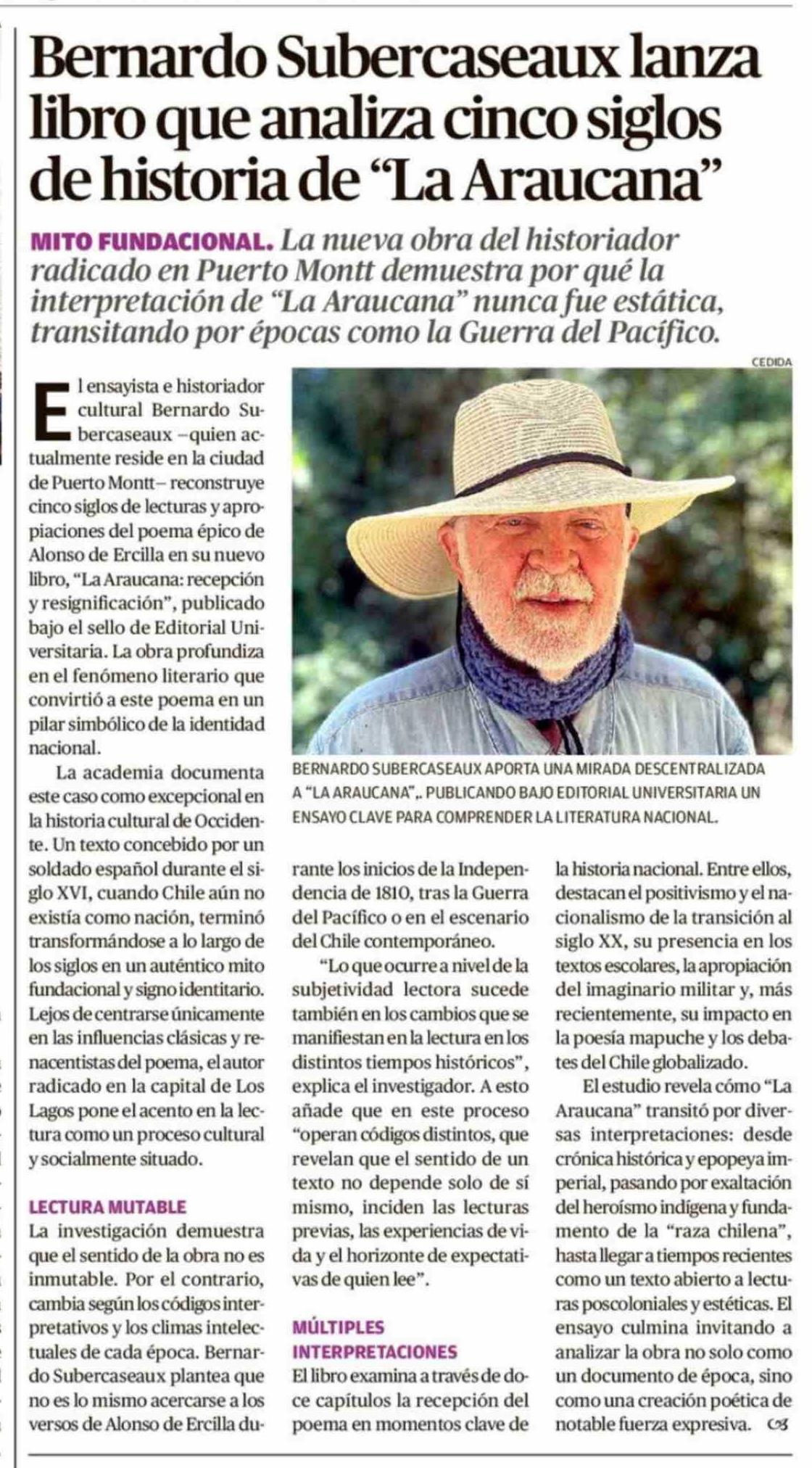 Bernardo Subercaseaux lanza libro que analiza cinco siglos de historia de "La Araucana"