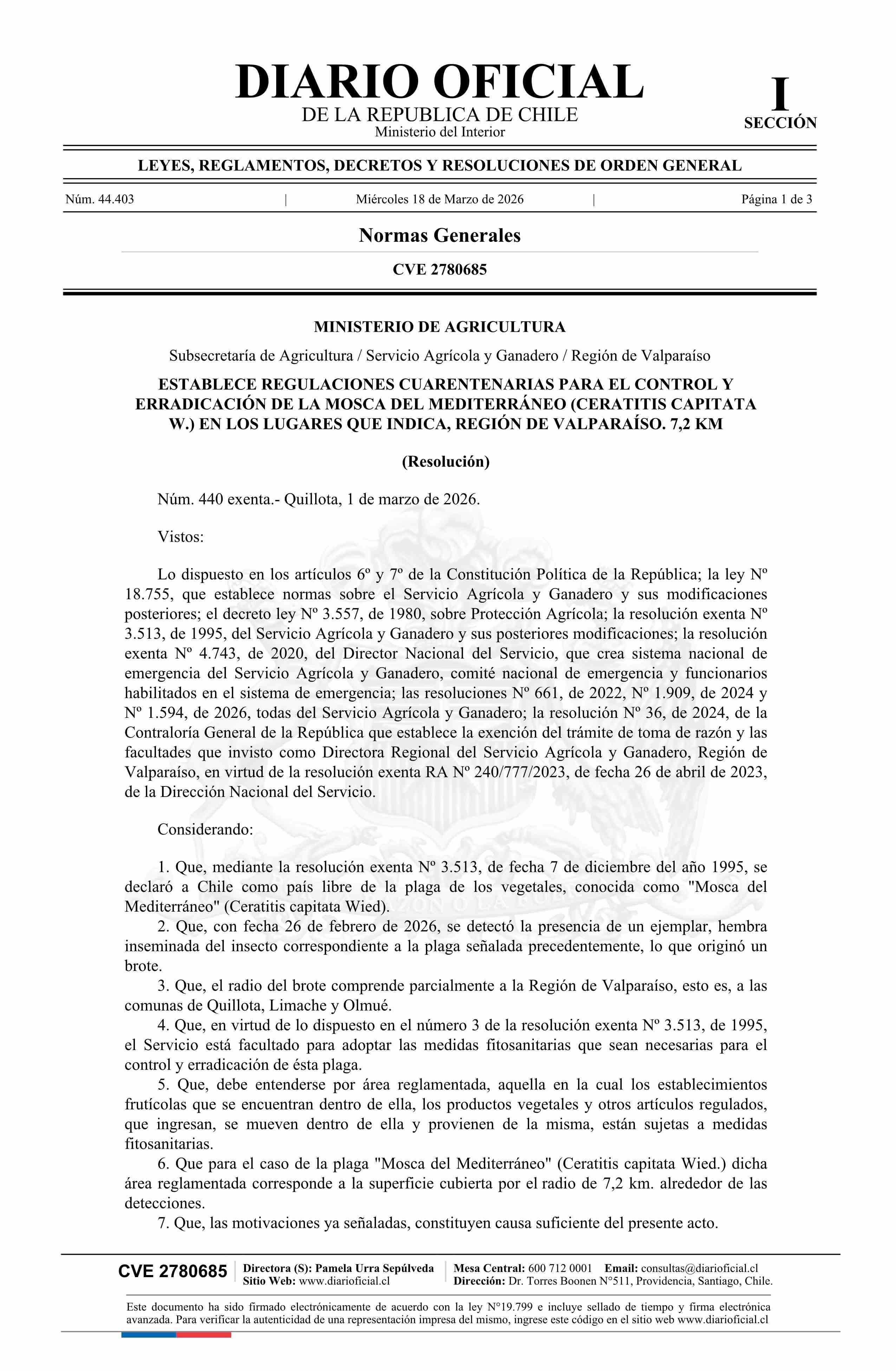 Título: Resolución exenta número 440, de 2026.- Establece regulaciones cuarentenarias para el control y erradicación de la Mosca del Mediterráneo (Ceratitis capitata W.) en los lugares que indica