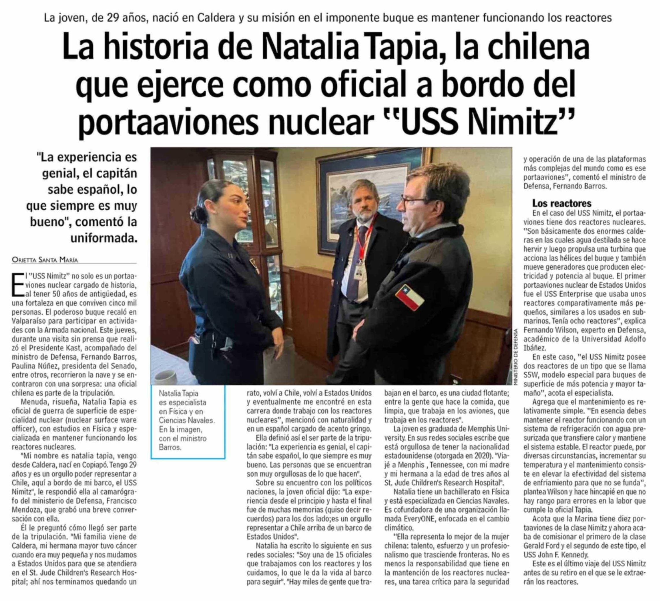 La historia de Natalia Tapia, la chilena que ejerce como oficial a bordo del portaaviones nuclear "USS Nimitz"