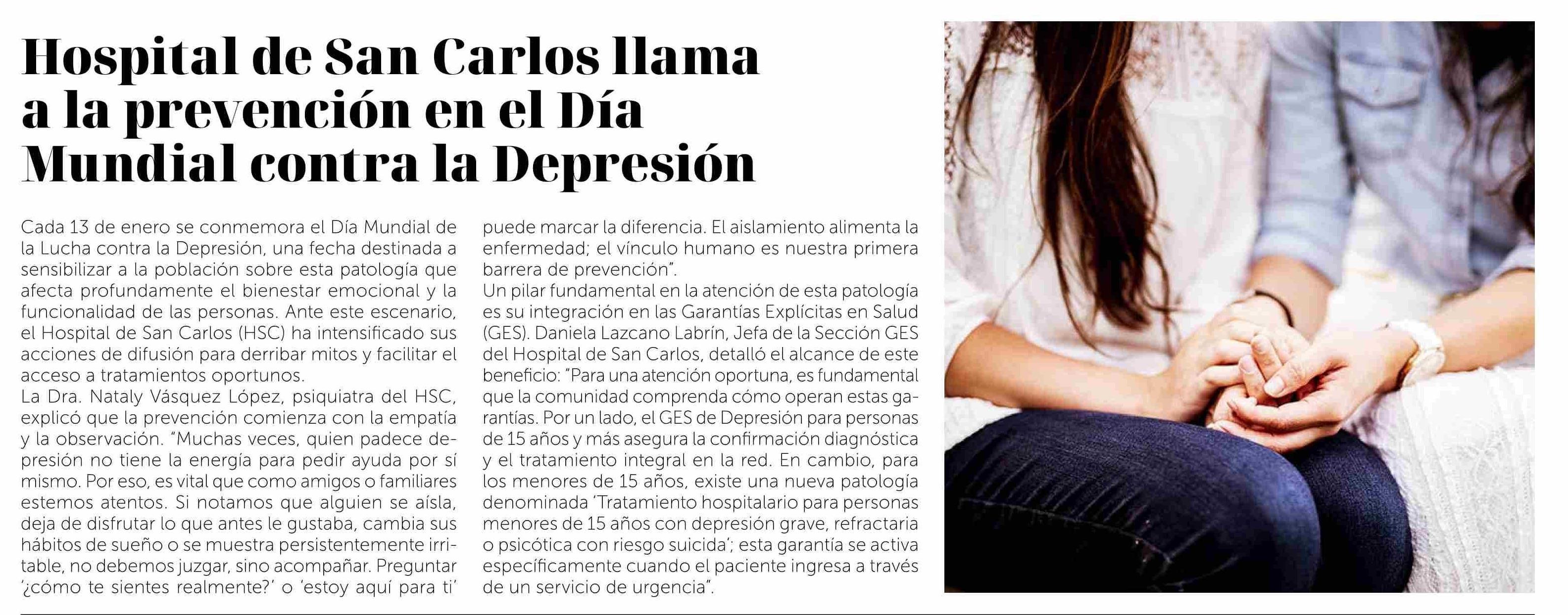 Hospital de San Carlos llama a la prevención en el Día Mundial contra la Depresión