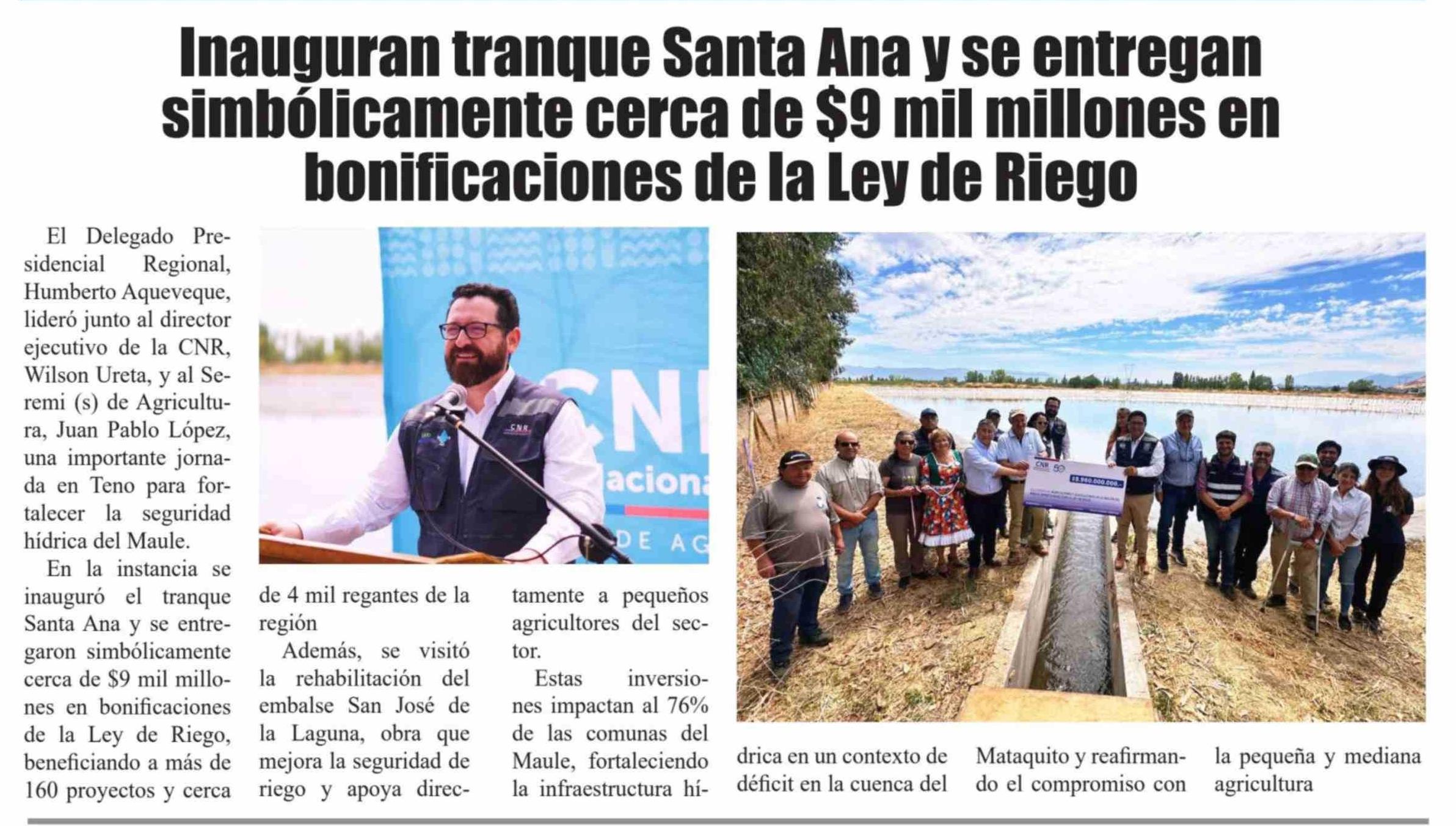 Inauguran tranque Santa Ana y se entregan simbólicamente cerca de $9 mil millones en bonificaciones de la Ley de Riego