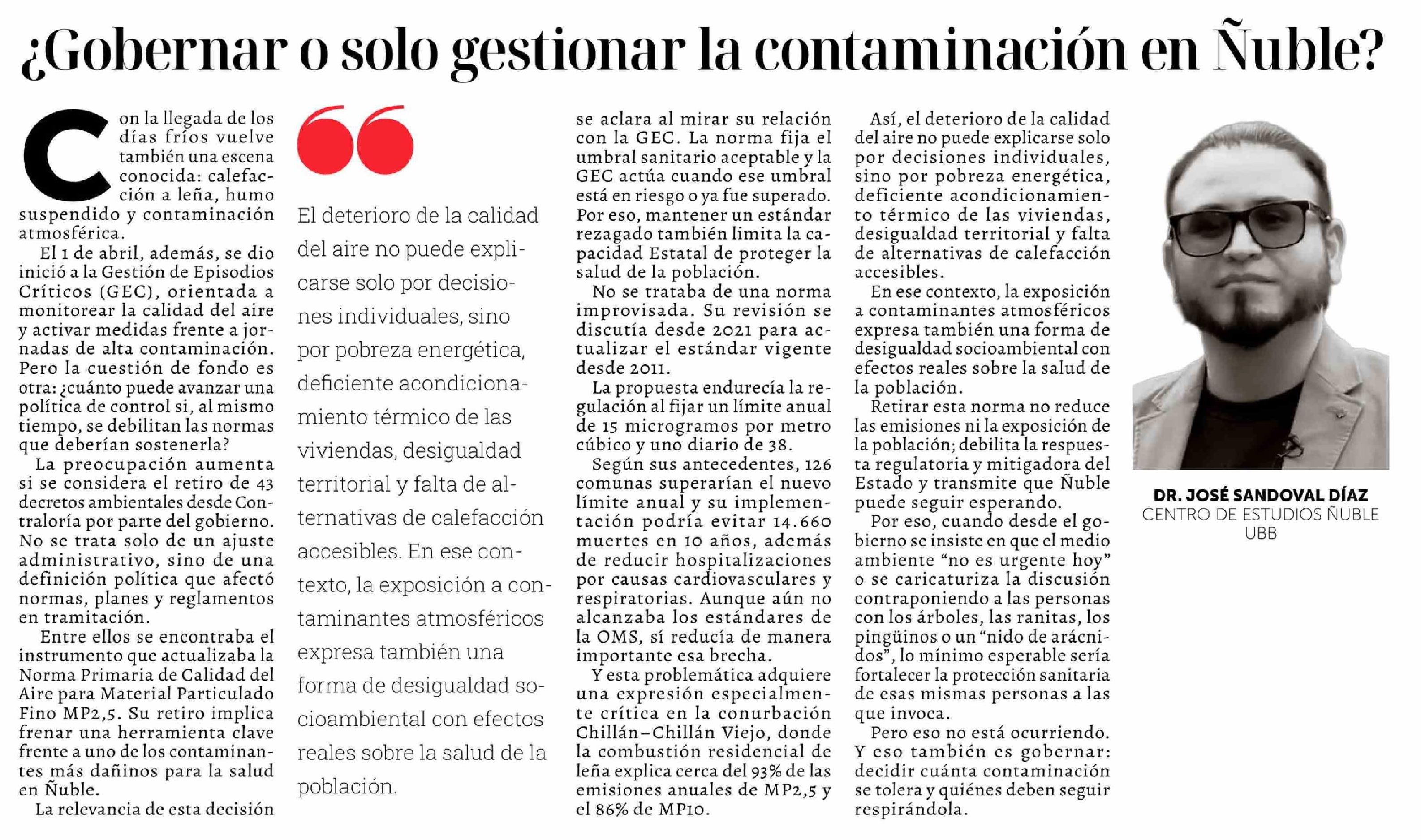 Columnas de Opinión: ¿Gobernar o solo gestionar la contaminación en Ñuble?