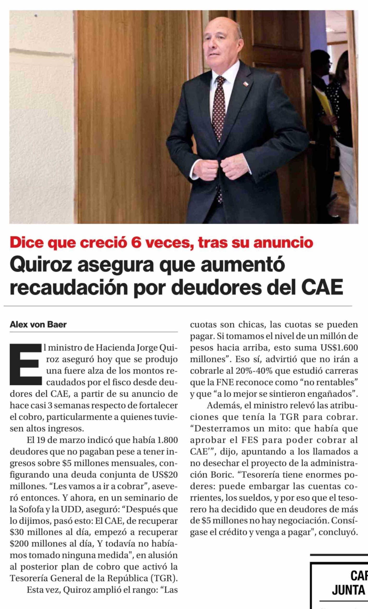 Quiroz asegura que aumentó recaudación por deudores del CAE