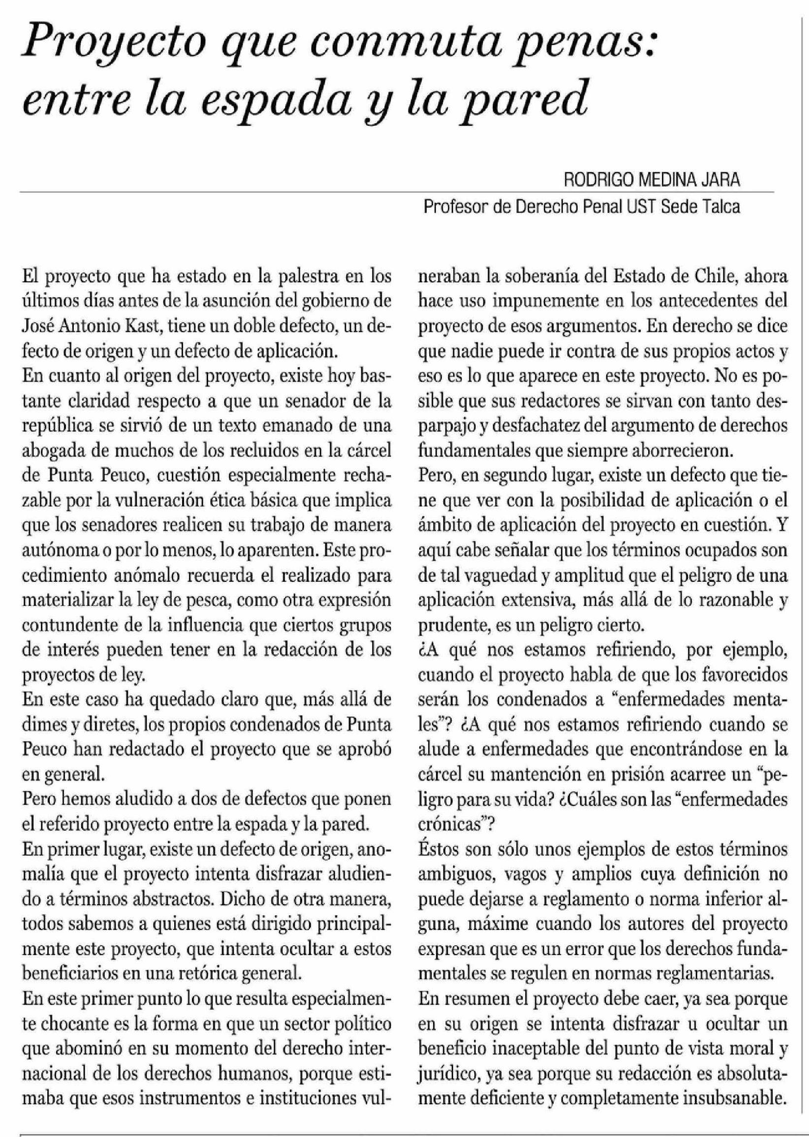 Cartas: Proyecto que conmuta penas: entre la espada y la pared
