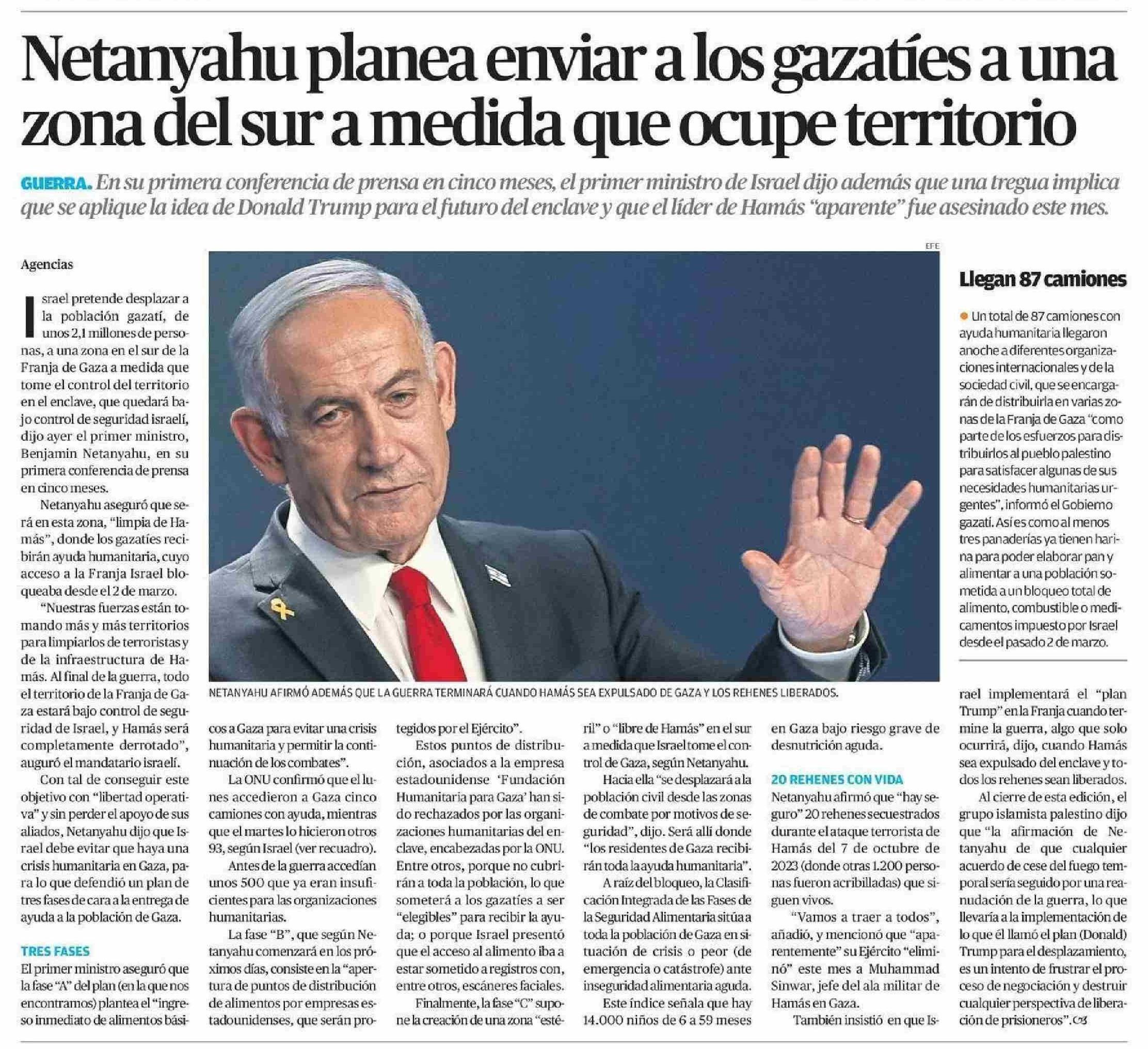 Netanyahu planea enviar a los gazatíes a una zona del sur a medida que ocupe territorio