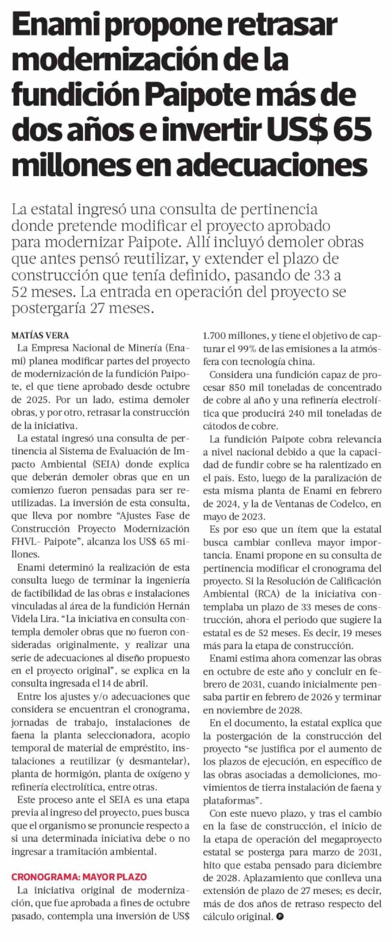 Enami propone retrasar modernización de la fundición Paipote más de dos años e invertir US$ 65 millones en adecuaciones