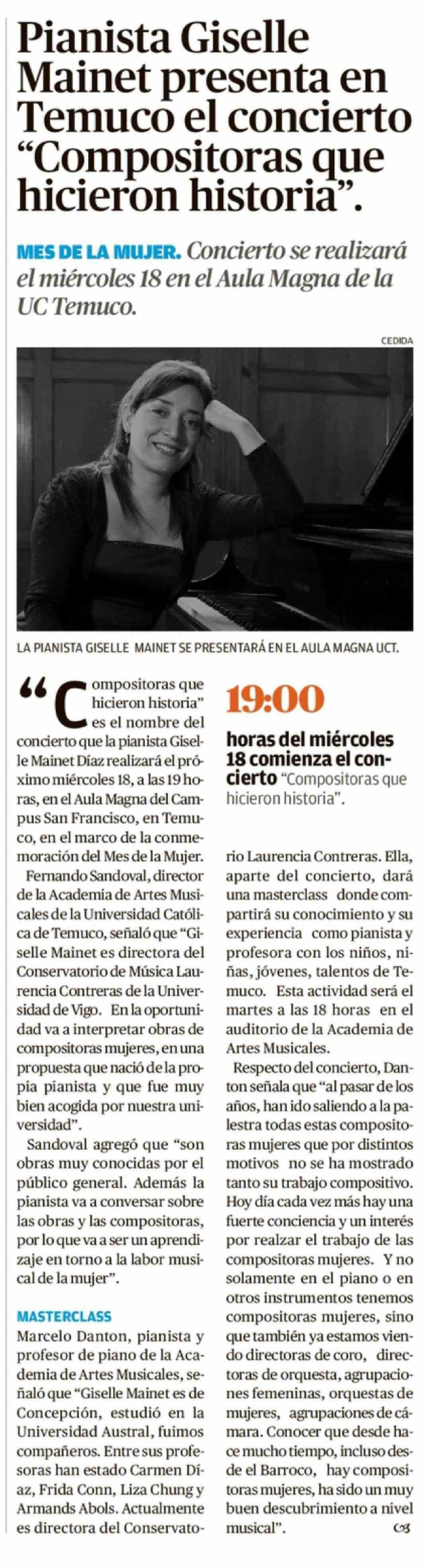 Pianista Giselle Mainet presenta en Temuco el concierto "Compositoras que hicieron historia".
