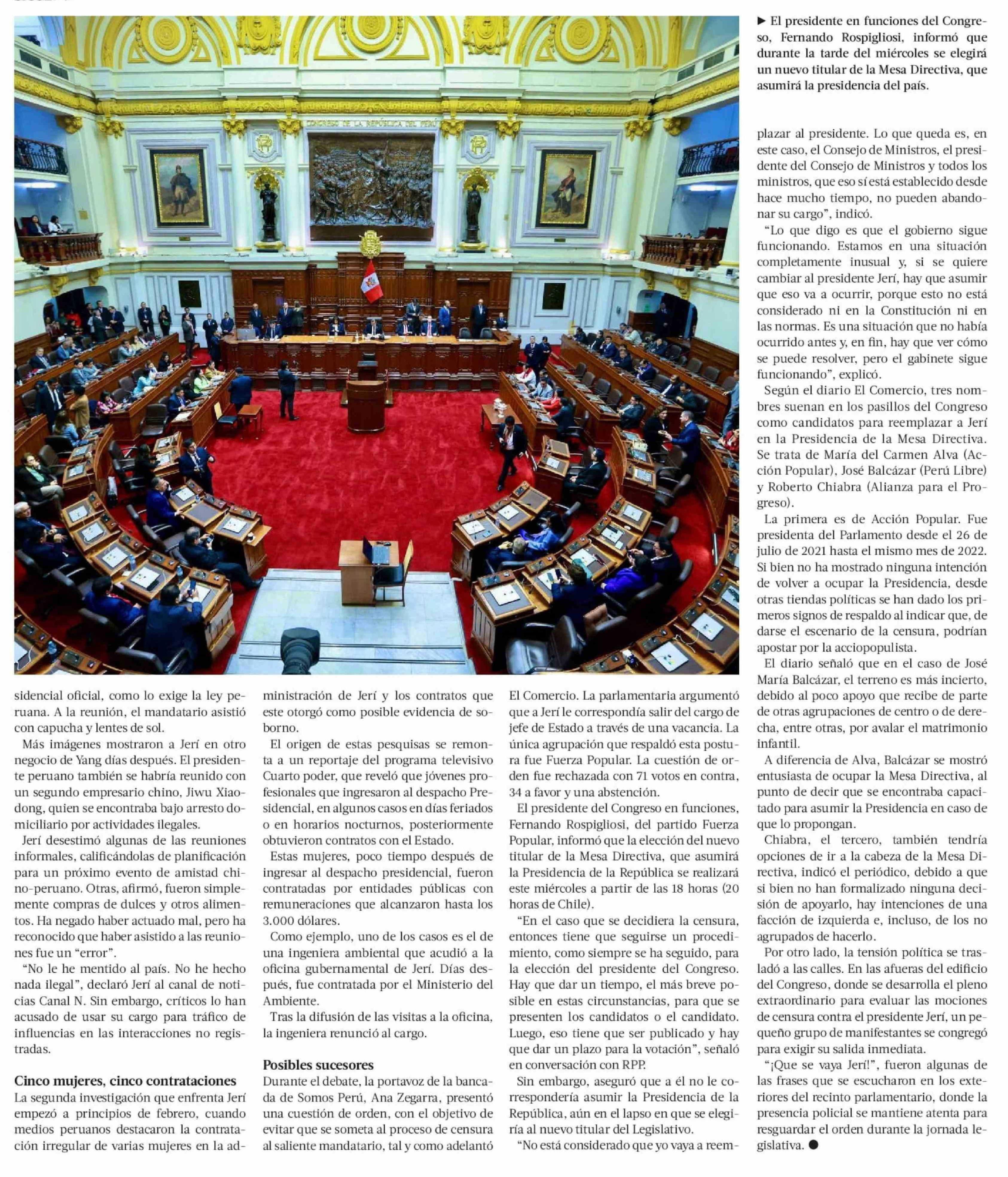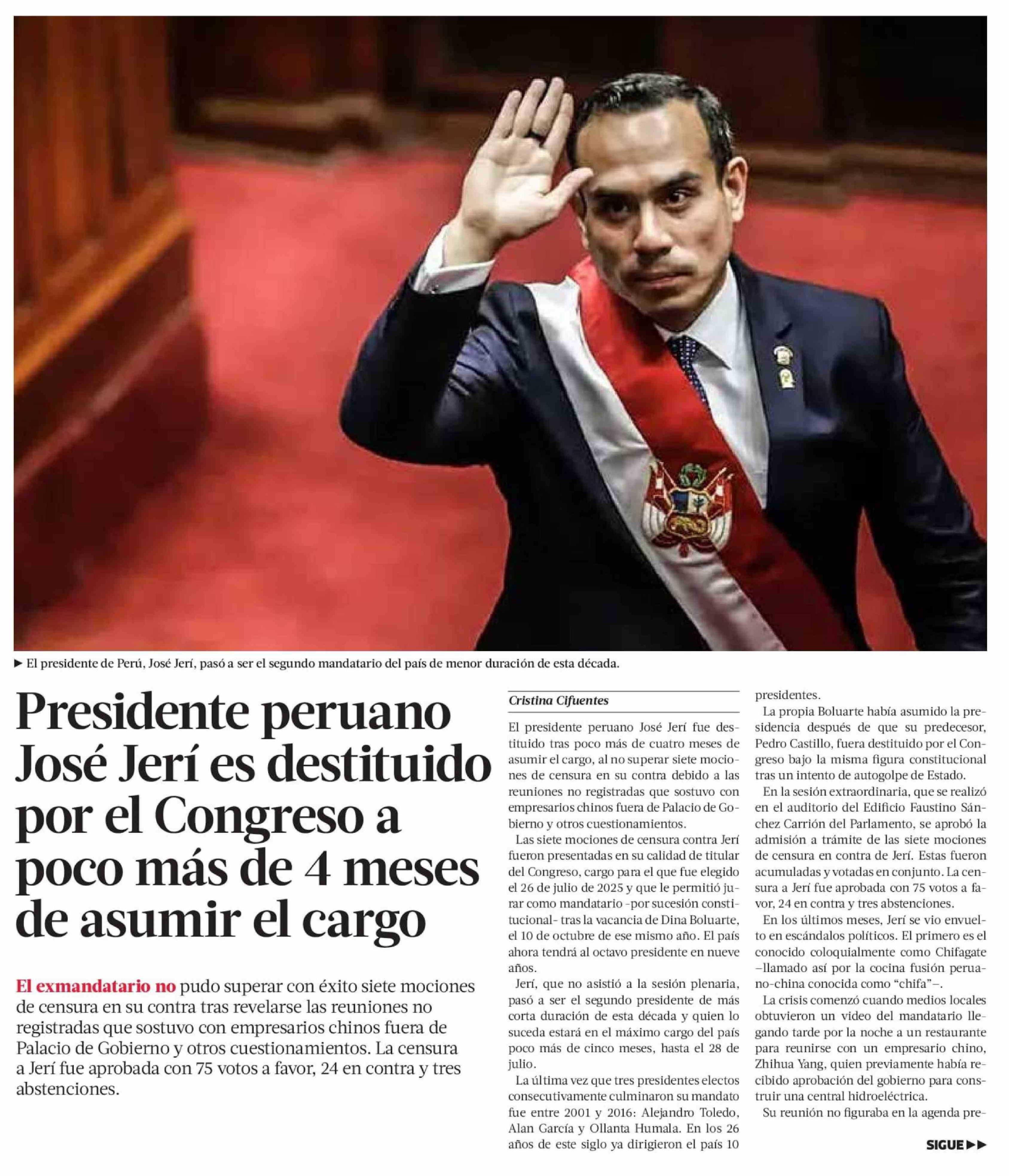 Presidente peruano José Jerí es destituido por el Congreso a poco más de 4 meses de asumir el cargo