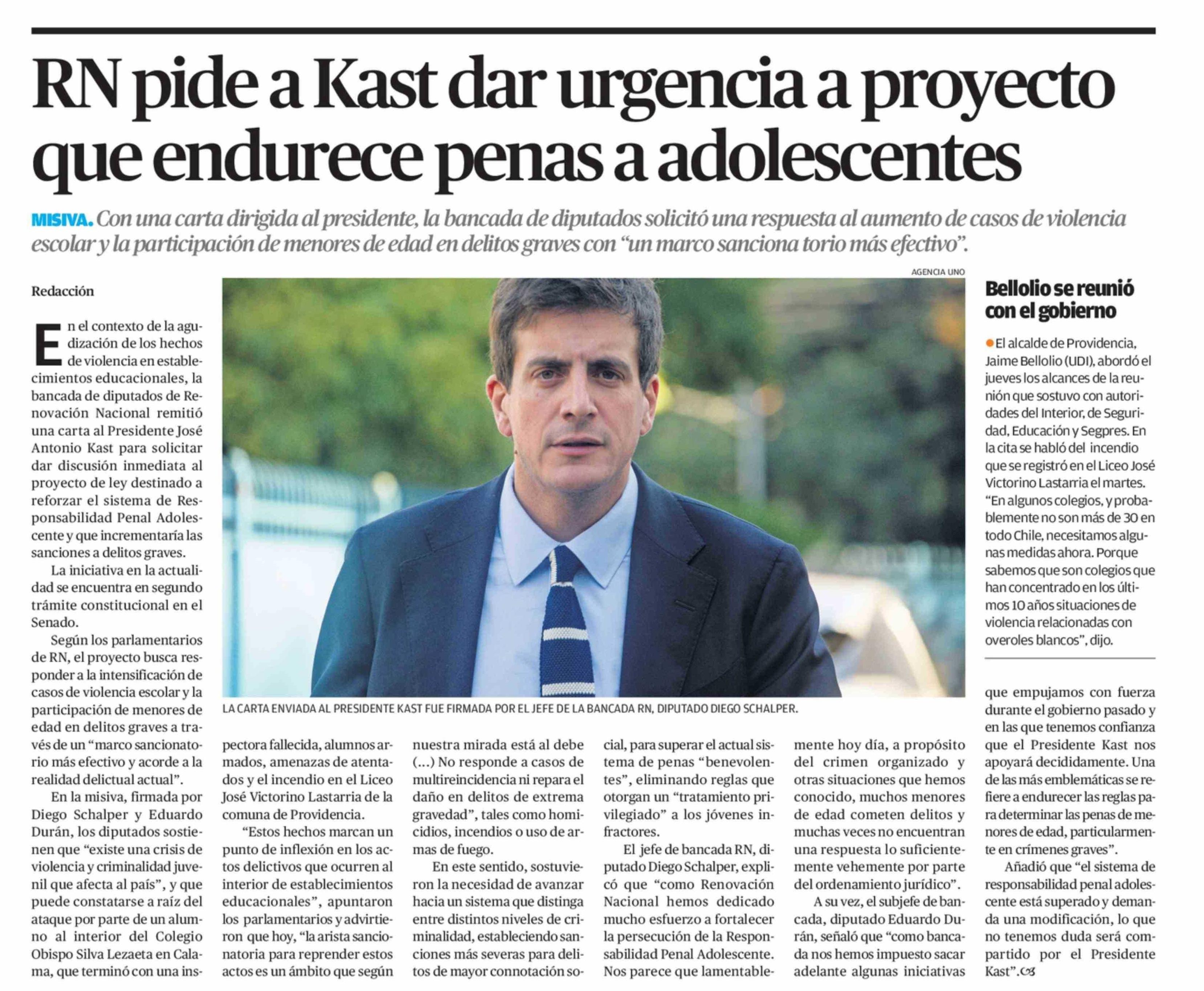 RN pide a Kast dar urgencia a proyecto que endurece penas a adolescentes