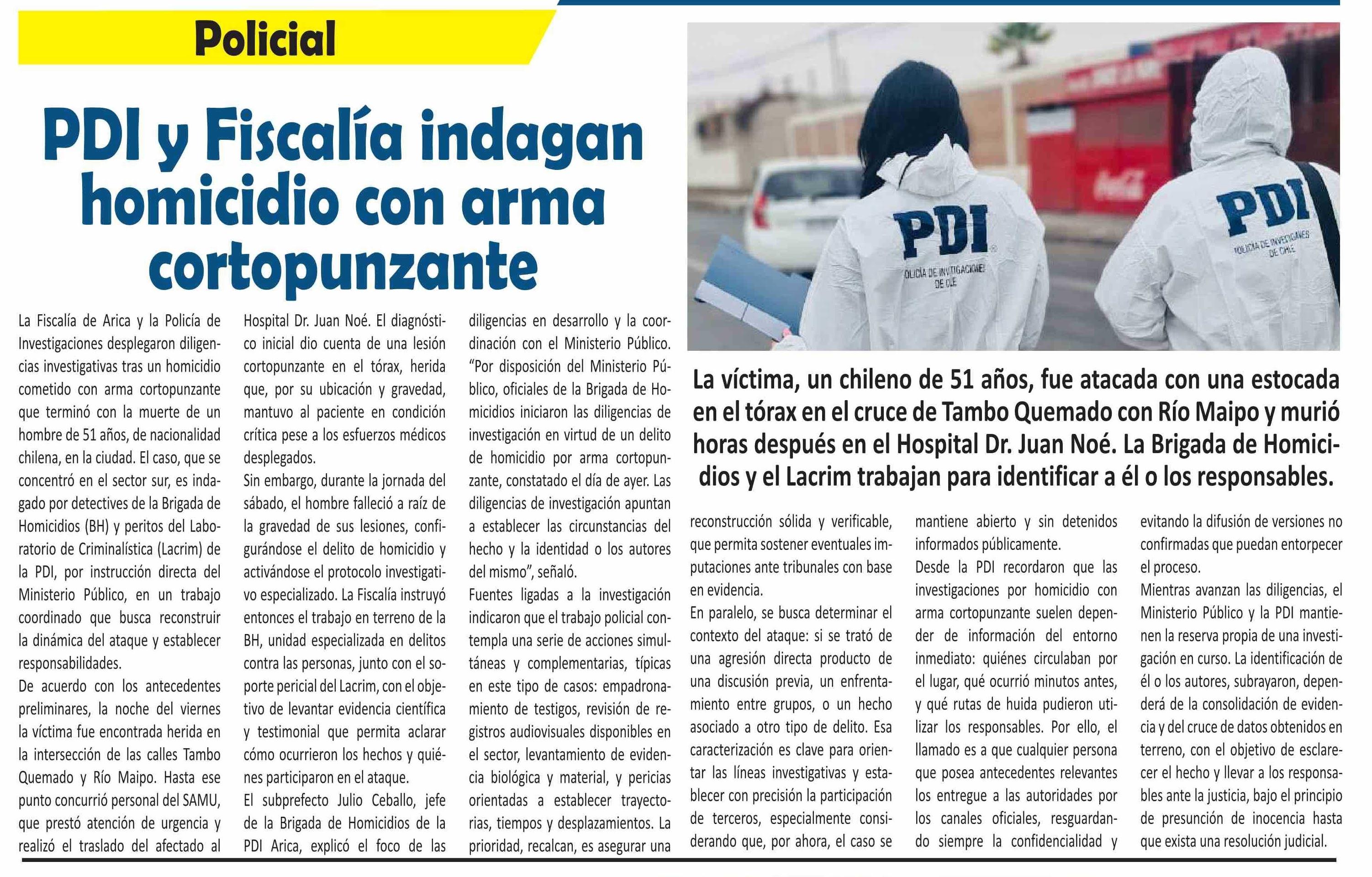PDI y Fiscalía indagan homicidio con arma cortopunzante
