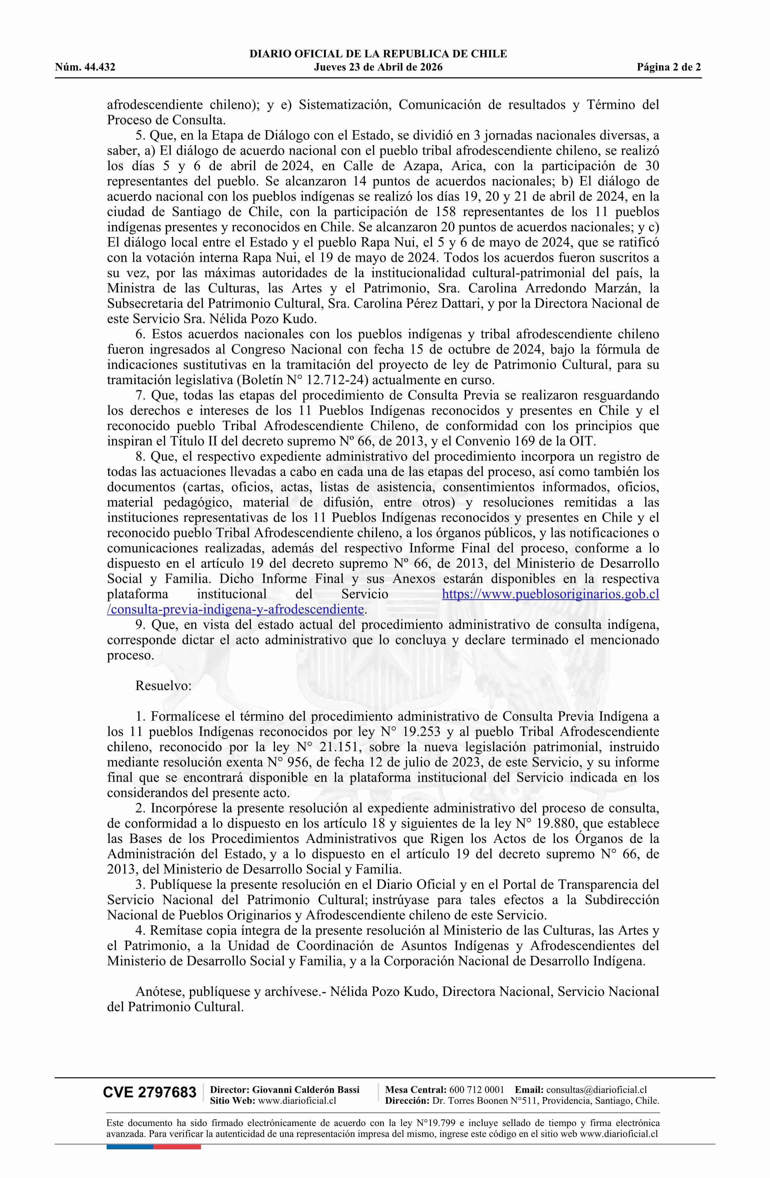 Título: Resolución exenta número 347, de 2026.- Formaliza el término del procedimiento de consulta previa a los Pueblos Indígenas y Tribal Afrodescendiente Chileno de alcance nacional, sobre la nueva legislación patrimonial