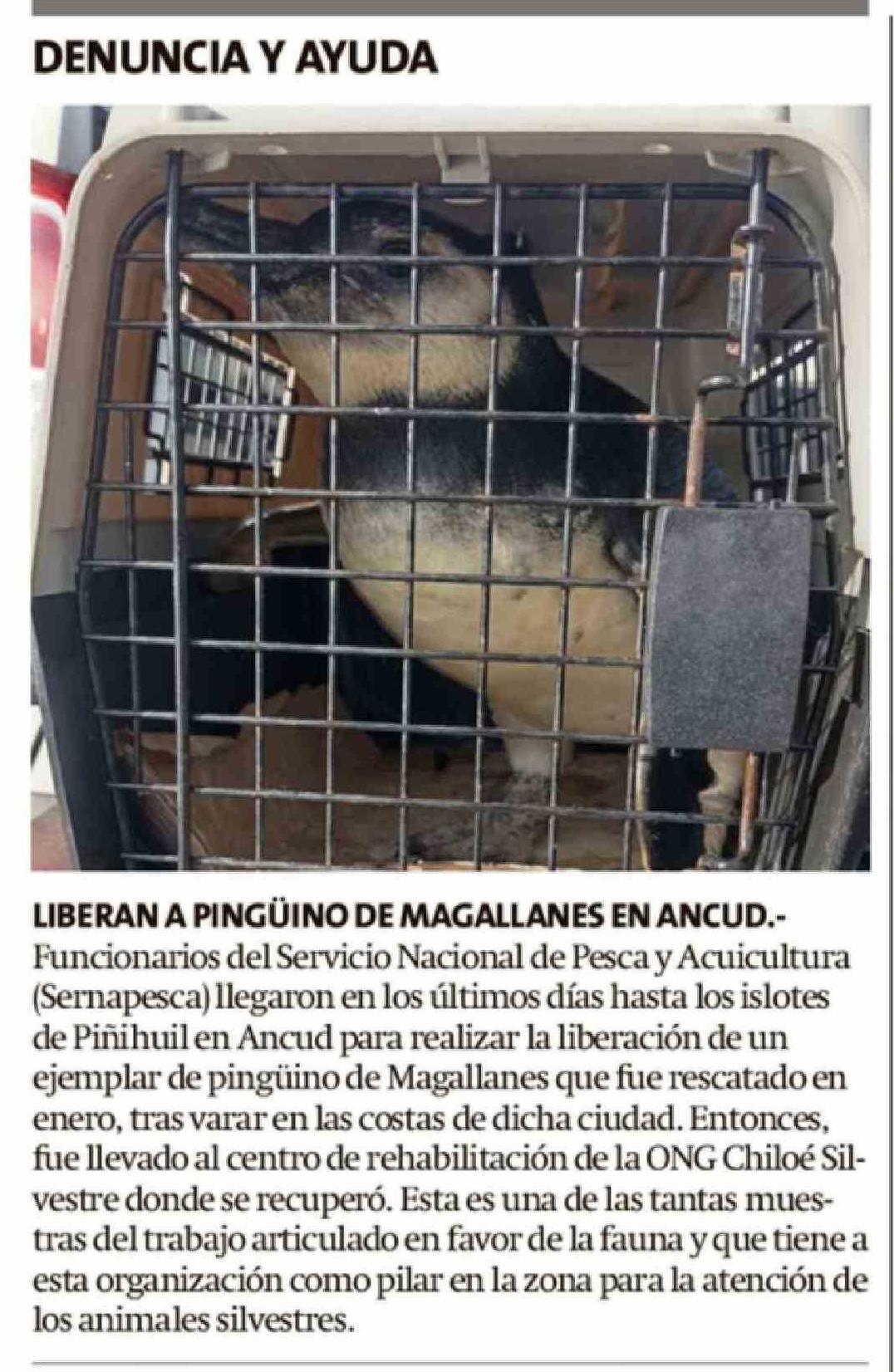 | Título: | LIBERAN A PINGÜINO DE MAGALLANES EN ANCUD .Funcionarios del Servicio Nacional de Pesca y Acuicultura (Sernapesca) llegaron en los últimos días hasta los islotes de Piñihuil en Ancud para realizar la liberación de un ejemplar de pingüino de Magallanes que fue rescatado en enero, tras varar en las cos |