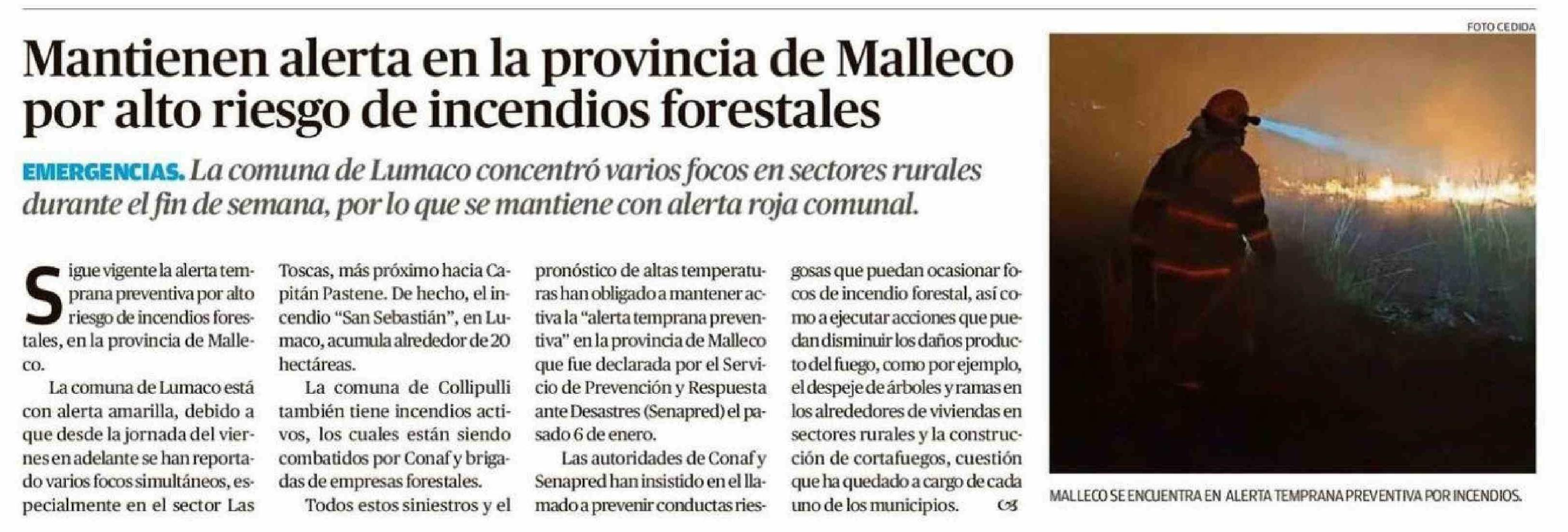 Mantienen alerta en la provincia de Malleco por alto riesgo de incendios forestales