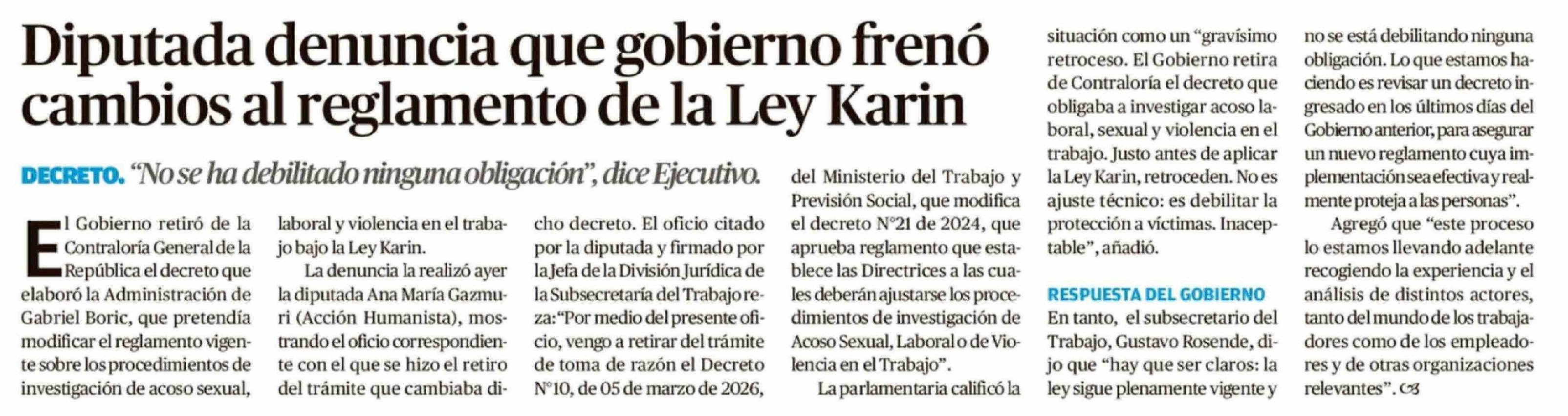 Diputada denuncia que gobierno frenó cambios al reglamento de la Ley Karin