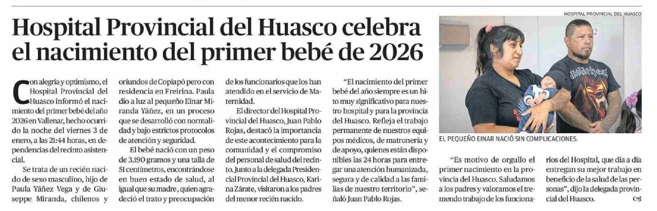 Hospital Provincial del Huasco celebra el nacimiento del primer bebé de 2026
