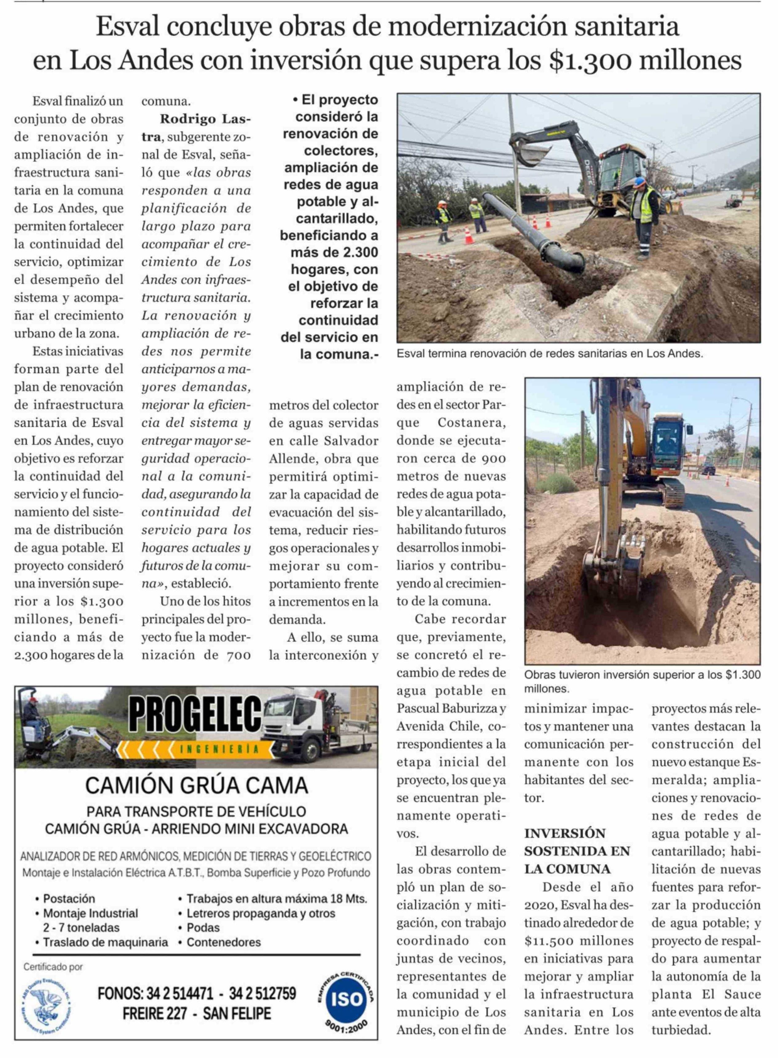 Esval concluye obras de modernización sanitaria en Los Andes con inversión que supera los $1.300 millones