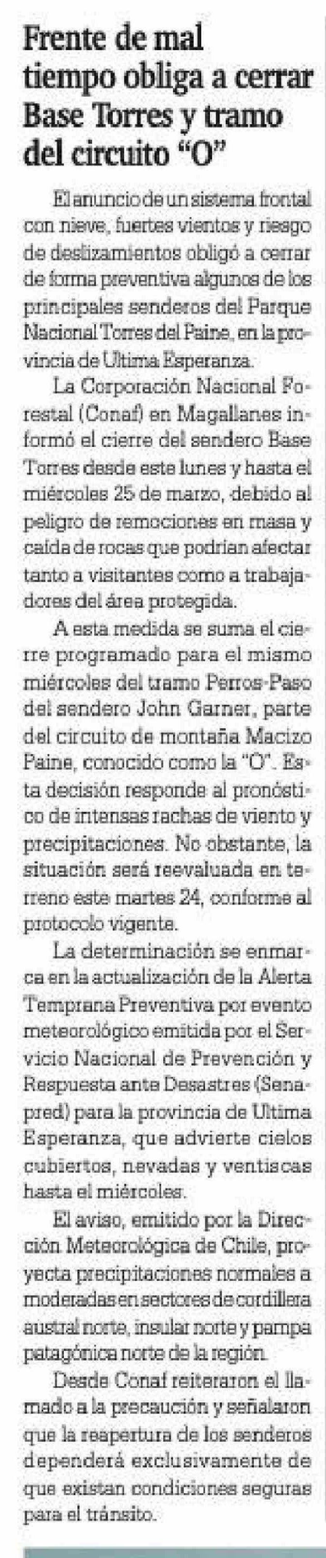 Frente de mal tiempo obliga a cerrar Base Torres y tramo del circuito "O"