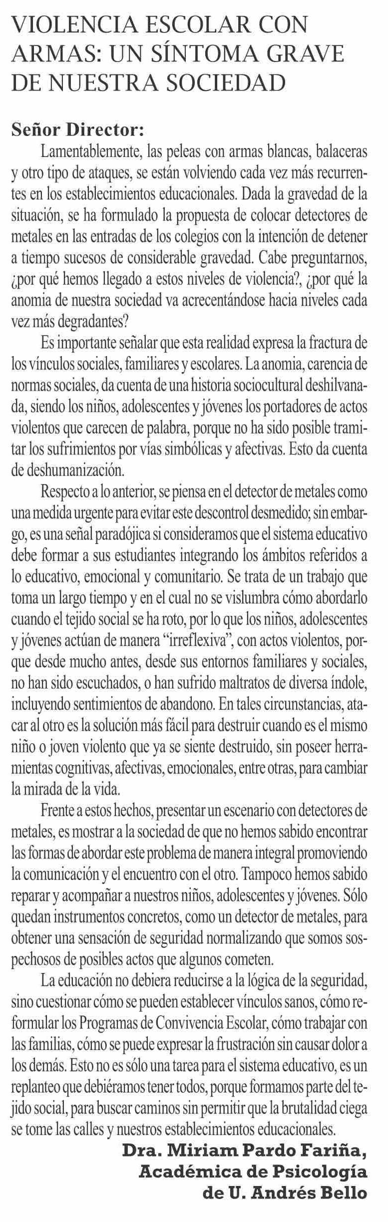 CARTAS: VIOLENCIA ESCOLAR CON ARMAS: UN SÍNTOMA GRAVE DE NUESTRA SOCIEDAD