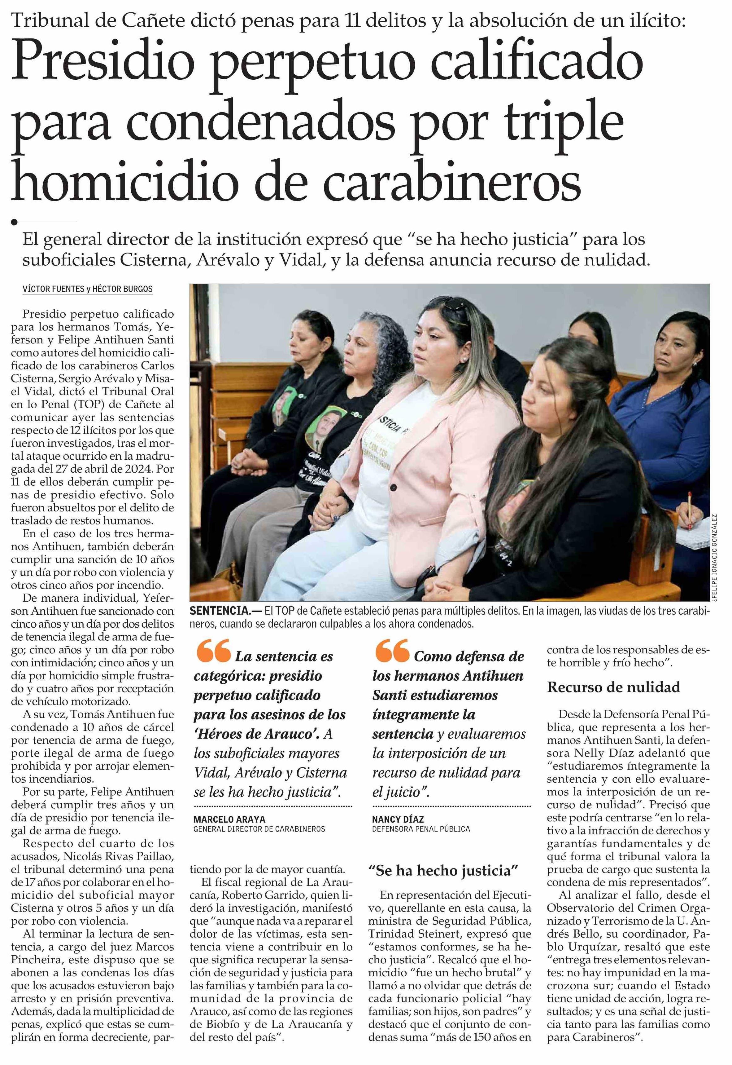 Presidio perpetuo calificado para condenados por triple homicidio de carabineros