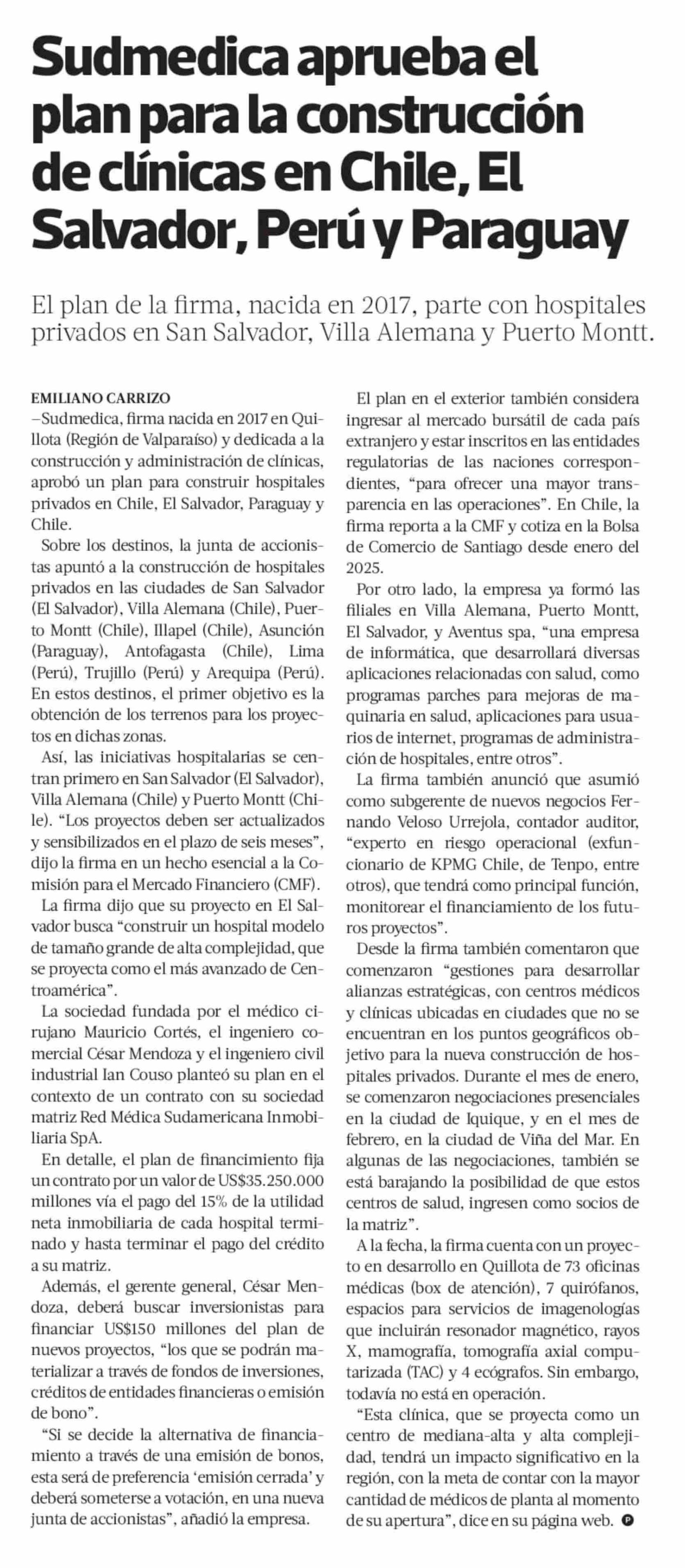 Sudmedica aprueba el plan para la construcción de clínicas en Chile, El Salvador, Perú y Paraguay