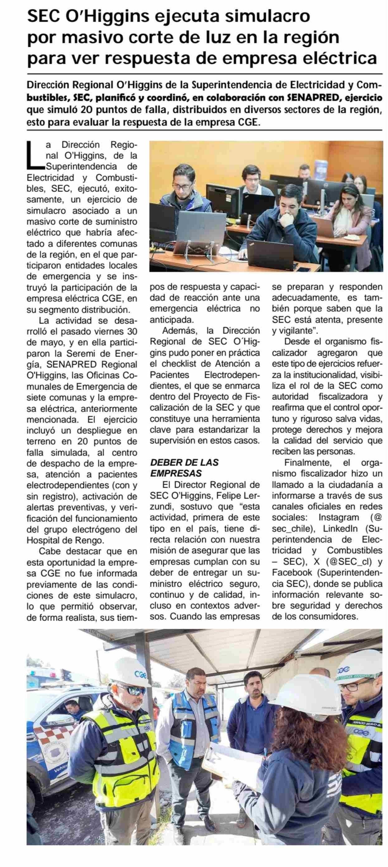 SEC O'Higgins ejecuta simulacro por masivo corte de luz en la región para ver respuesta de empresa eléctrica