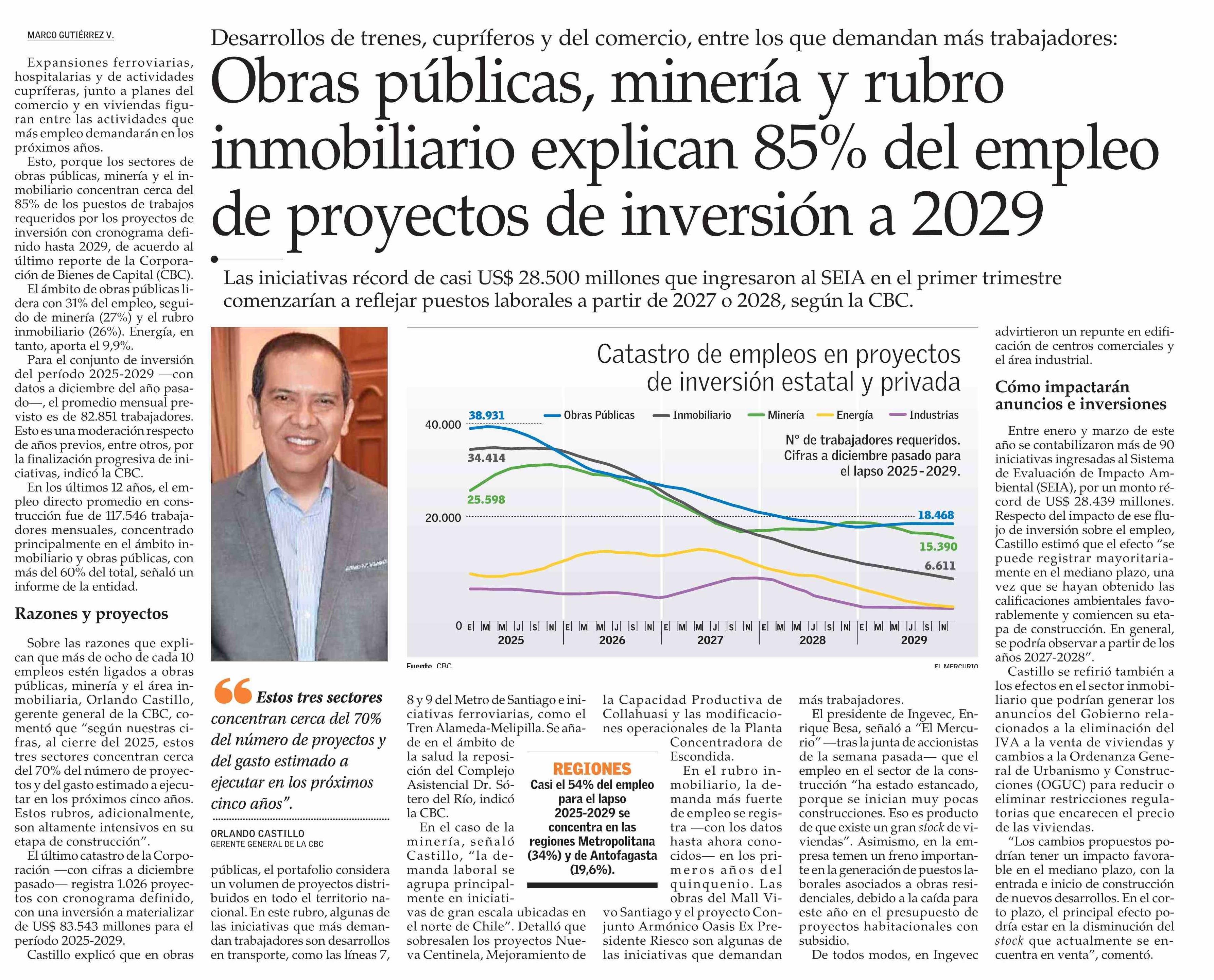 Obras públicas, minería y rubro inmobiliario explican 85% del empleo de proyectos de inversión a 2029