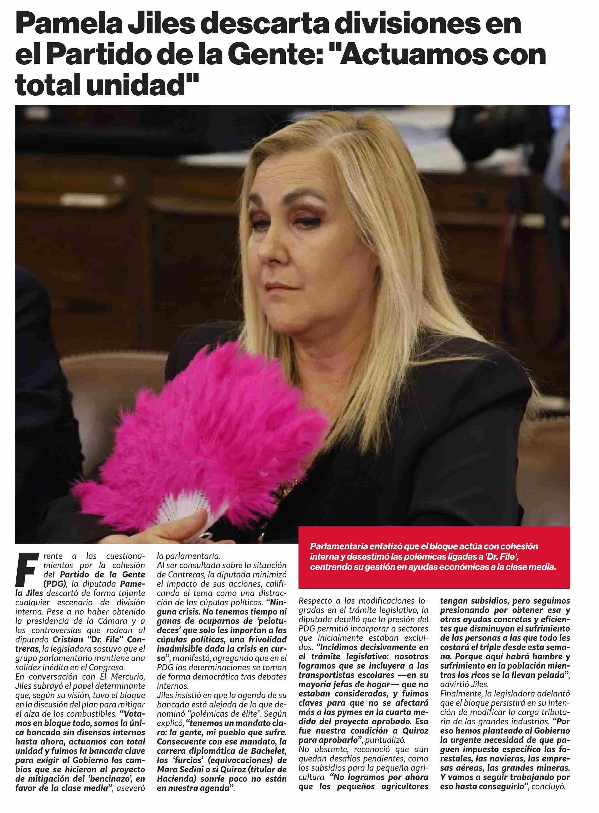 Pamela Jiles descarta divisiones en el Partido de la Gente: "Actuamos con total unidad"