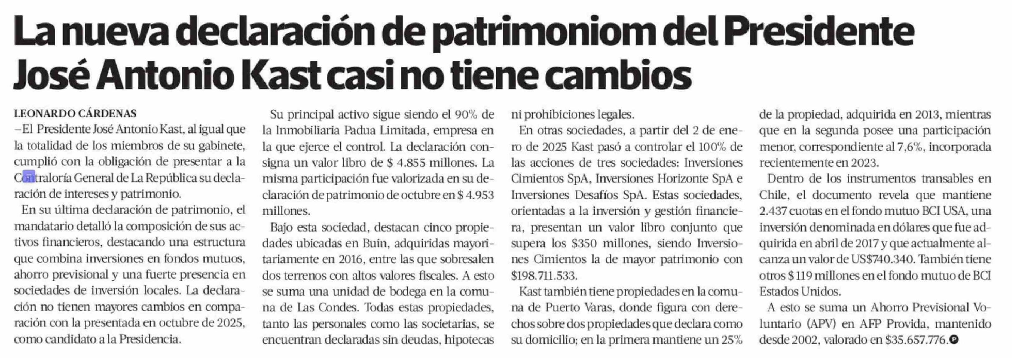 La nueva declaración de patrimoniom del Presidente José Antonio Kast casi no tiene cambios