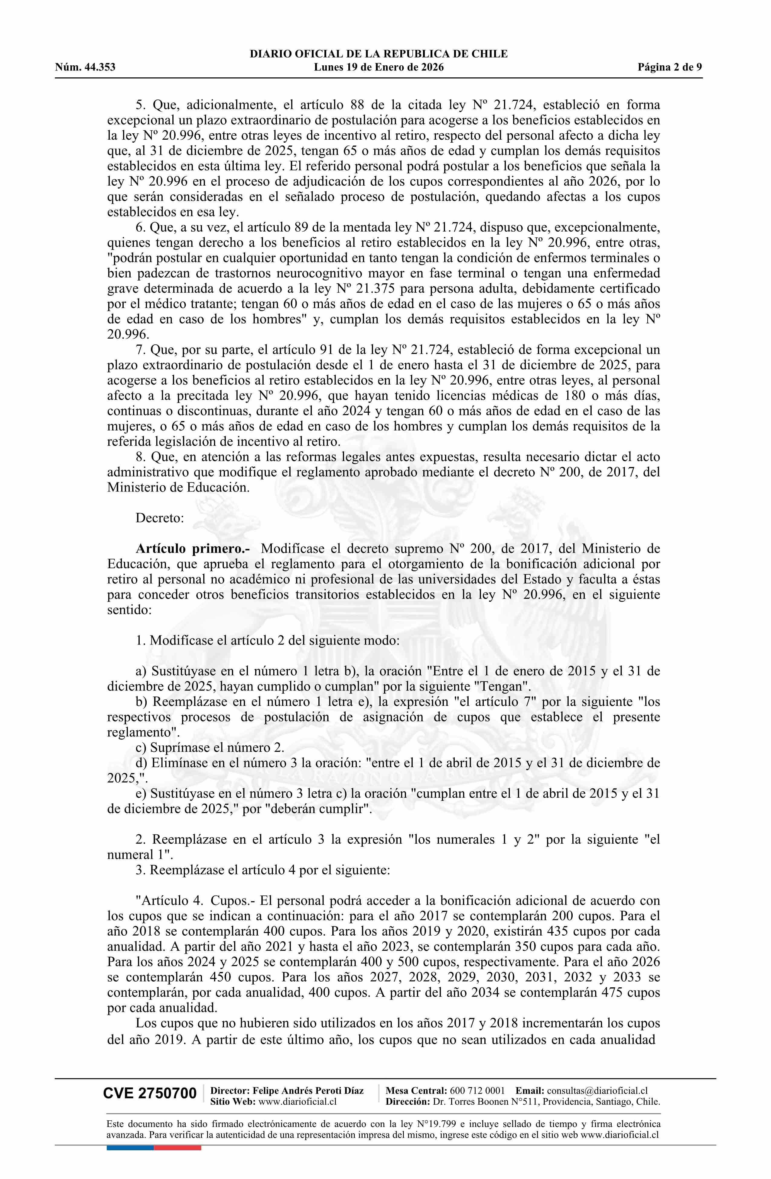 Título: Decreto número 129, de 2025.- Modifica decreto Nº 200, de 2017, que aprueba el Reglamento para el otorgamiento de la bonificación adicional por retiro al personal no académico ni profesional de las universidades del Estado y faculta a éstas para conceder otros beneficios transitorios establecidos en
