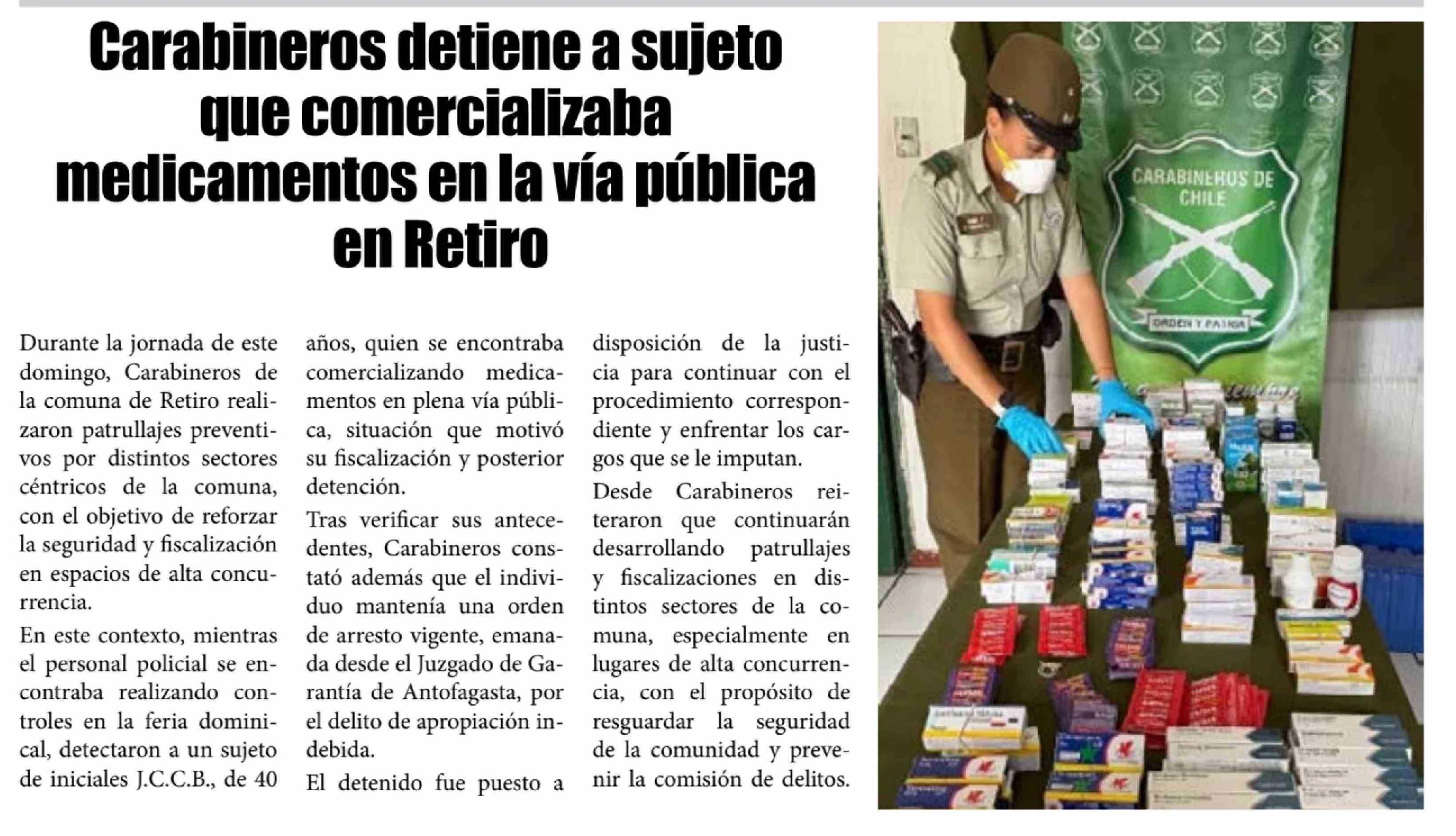 Carabineros detiene a sujeto que comercializaba medicamentos en la vía pública en Retiro