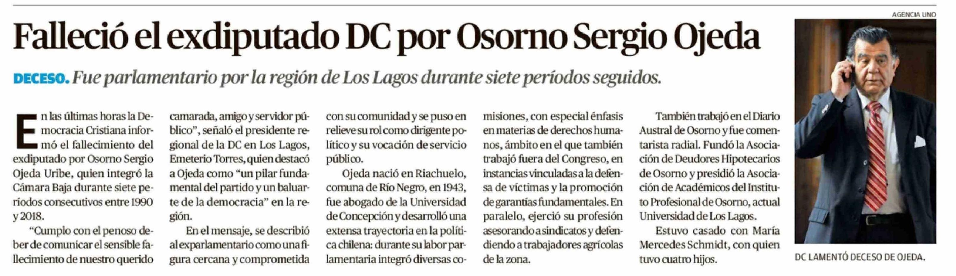 Falleció el exdiputado DC por Osorno Sergio Ojeda