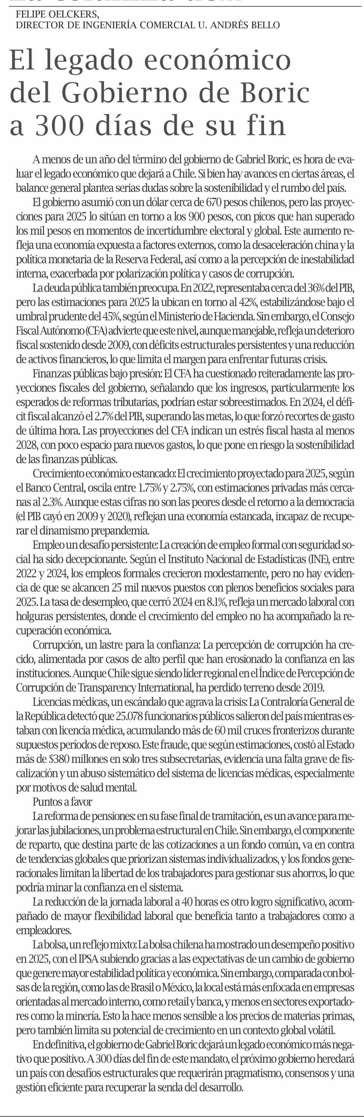 Columnas de Opinión: El legado económico del Gobierno de Boric a 300 días de su fin