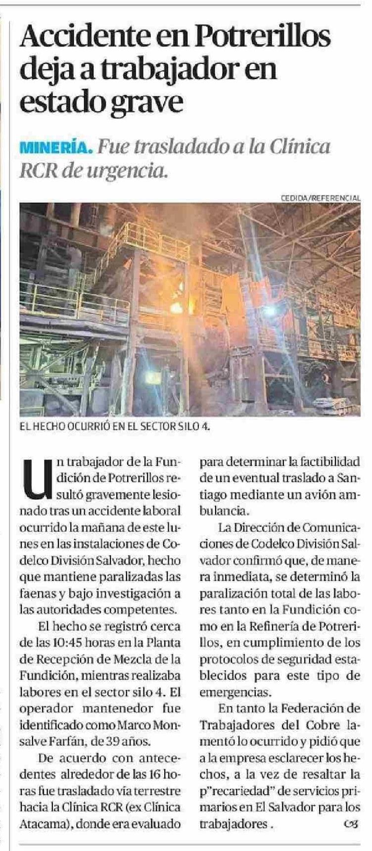 Accidente en Potrerillos deja a trabajador en estado grave
