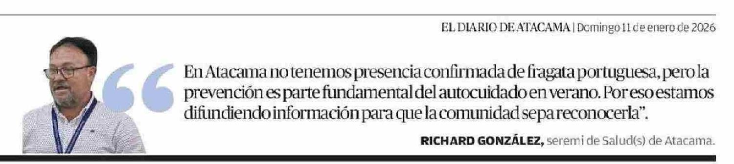 | Título: | "En Atacama no tenemos presencia confirmada de fragata portuguesa, pero la prevención es parte fundamental del autocuidado en verano. Por eso estamos difundiendo información para que la comunidad sepa reconocerla". RICHARD GONZÁLEZ, seremi de Salud(s) de Atacama. |