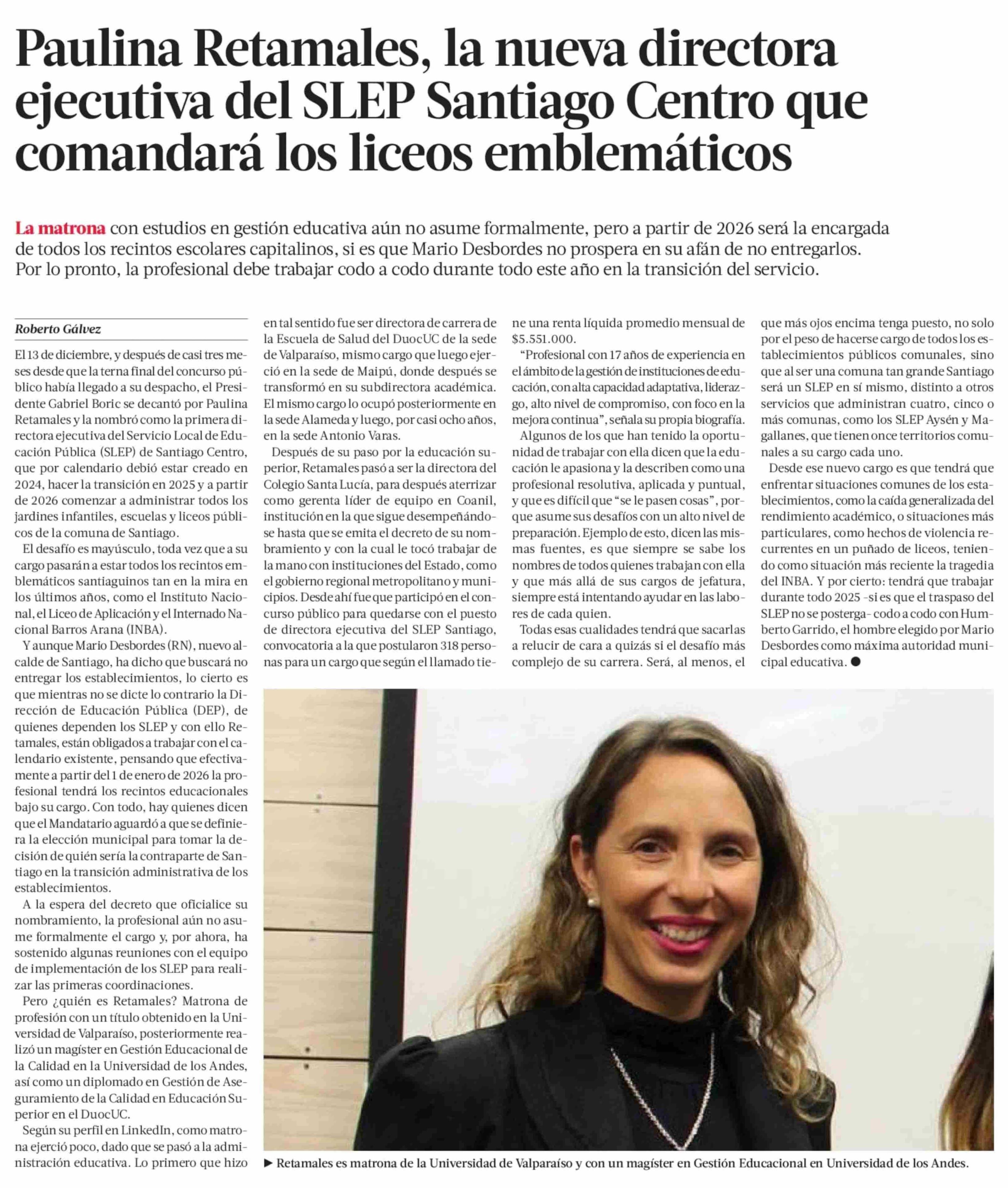 Paulina Retamales, la nueva directora ejecutiva del SLEP Santiago Centro que comandará los liceos emblemáticos