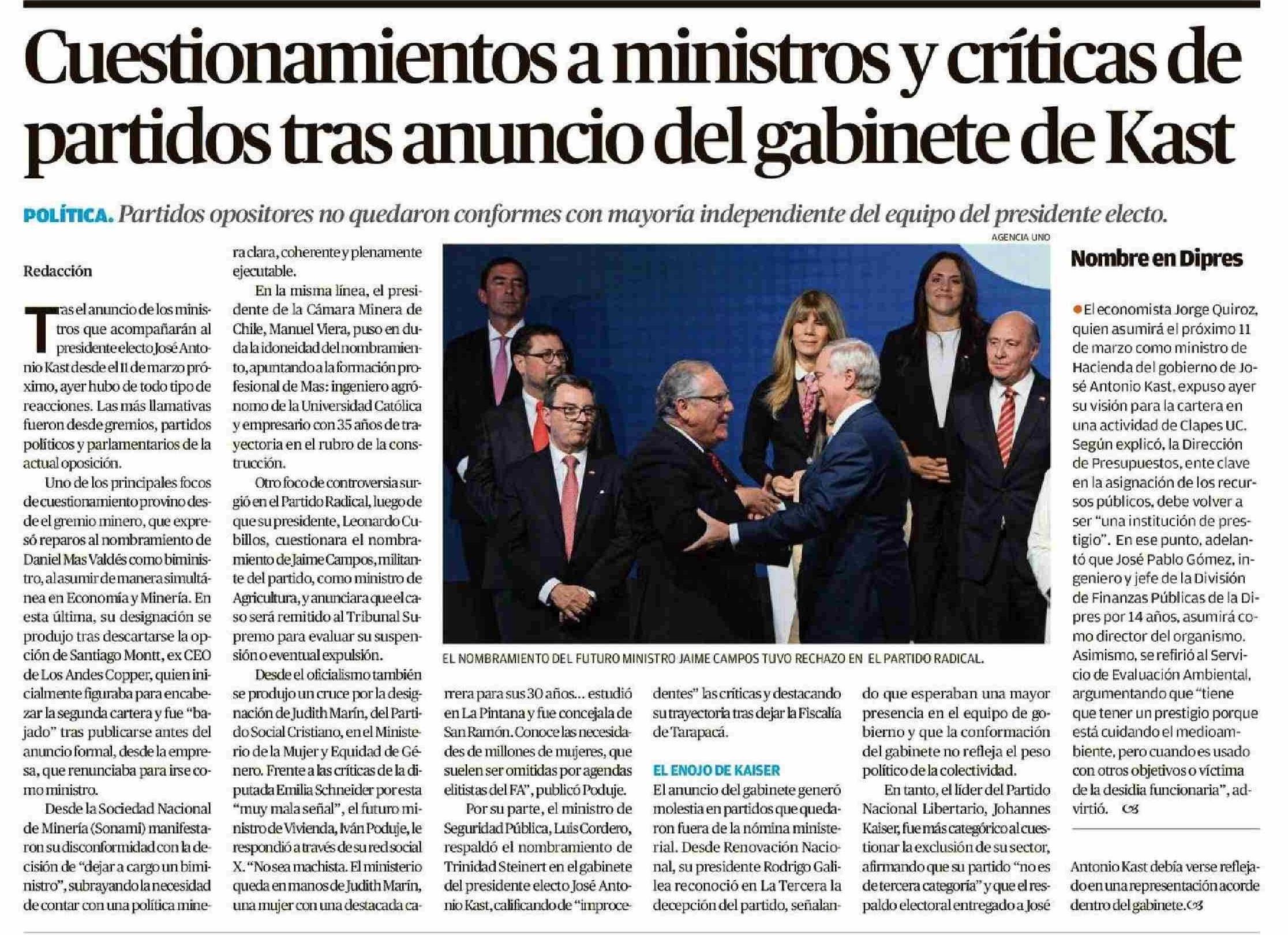Cuestionamientos a ministros y críticas de partidos tras anuncio del gabinete de Kast